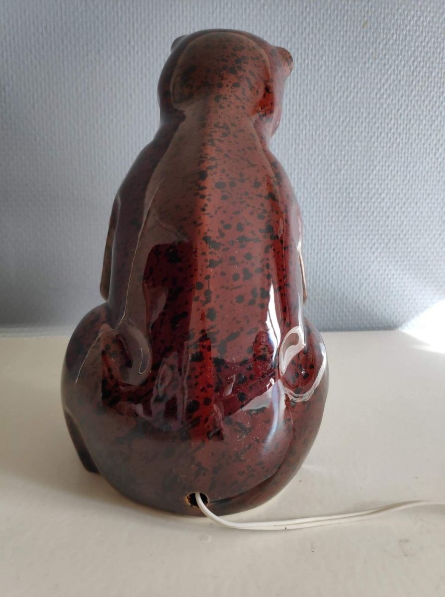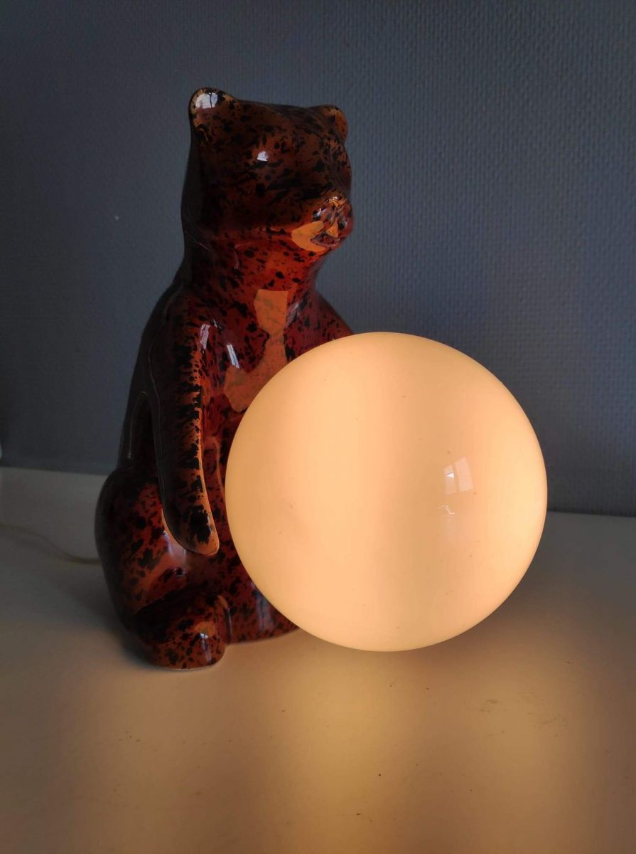 lampe ours vintage en céramique marron et globe opaline blanc des années 80