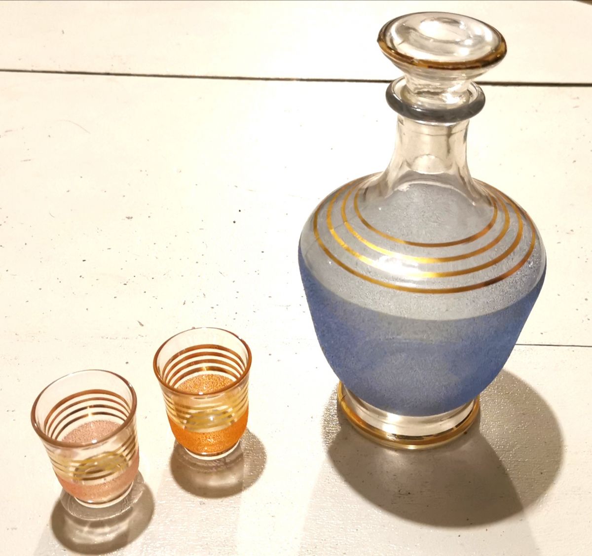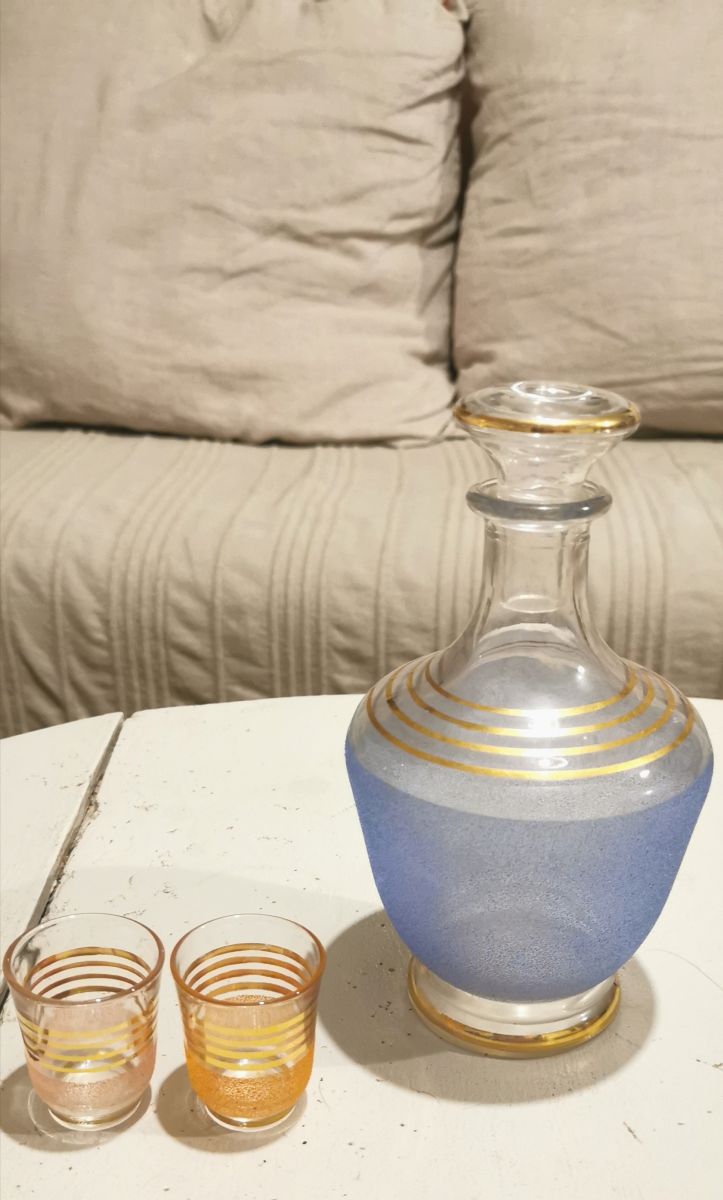Carafe à liqueur avec son bouchon et ses 2 verres