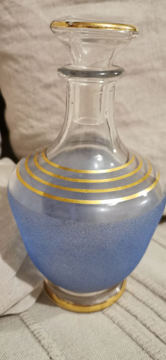 Carafe avec son bouchon en verre granité bleu et liserets dorés ainsi que ses deux minis verres granités orange et rose.