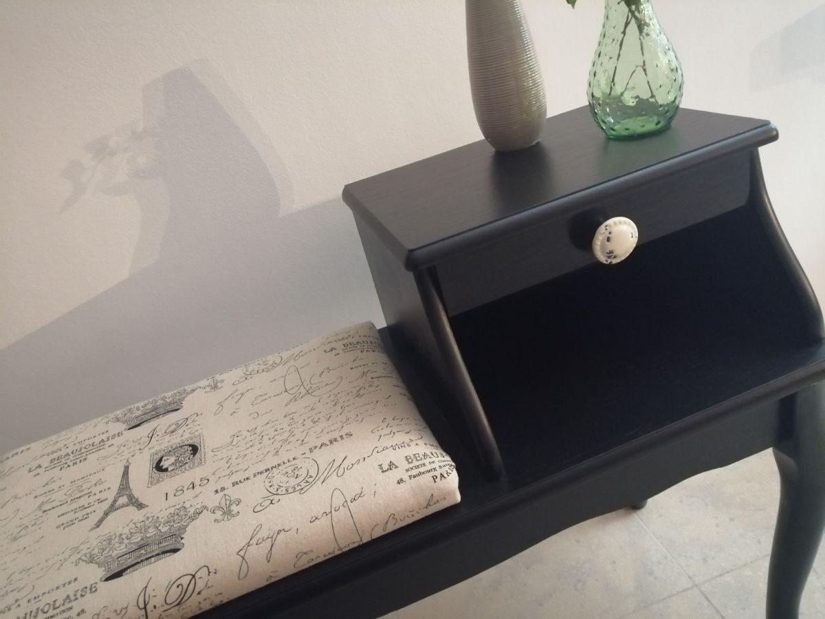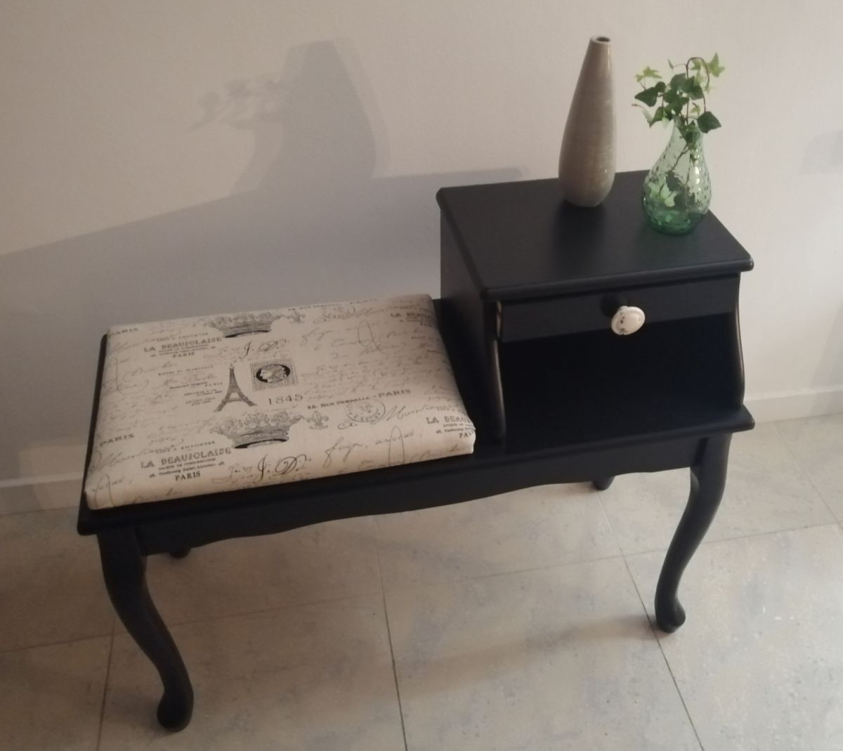 Meuble banquette telephone en bois relooke .entièrement avec peinture de qualité.. Assise refaite avec un tissu type jute Paris. dimension : longueur 79cm profondeur 34cm hauteur 63cm superbe dans une entrée ou bien dans une chambre livraison possible sur demande.