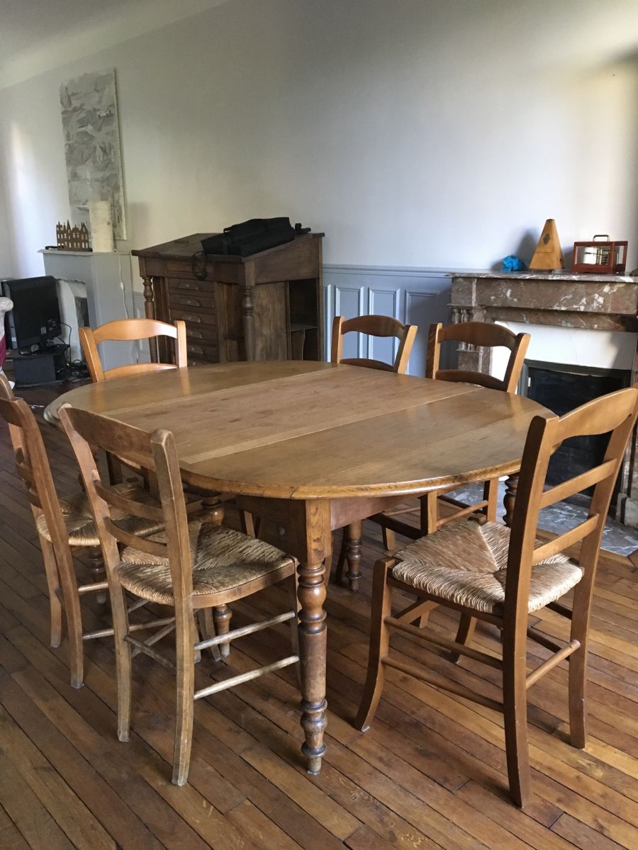 À vendre, table en chêne, 6 pieds, 2 rallonges de 60 cm chacune, longueur max 2,20 largeur 1,15. Petits côtés rabattables.