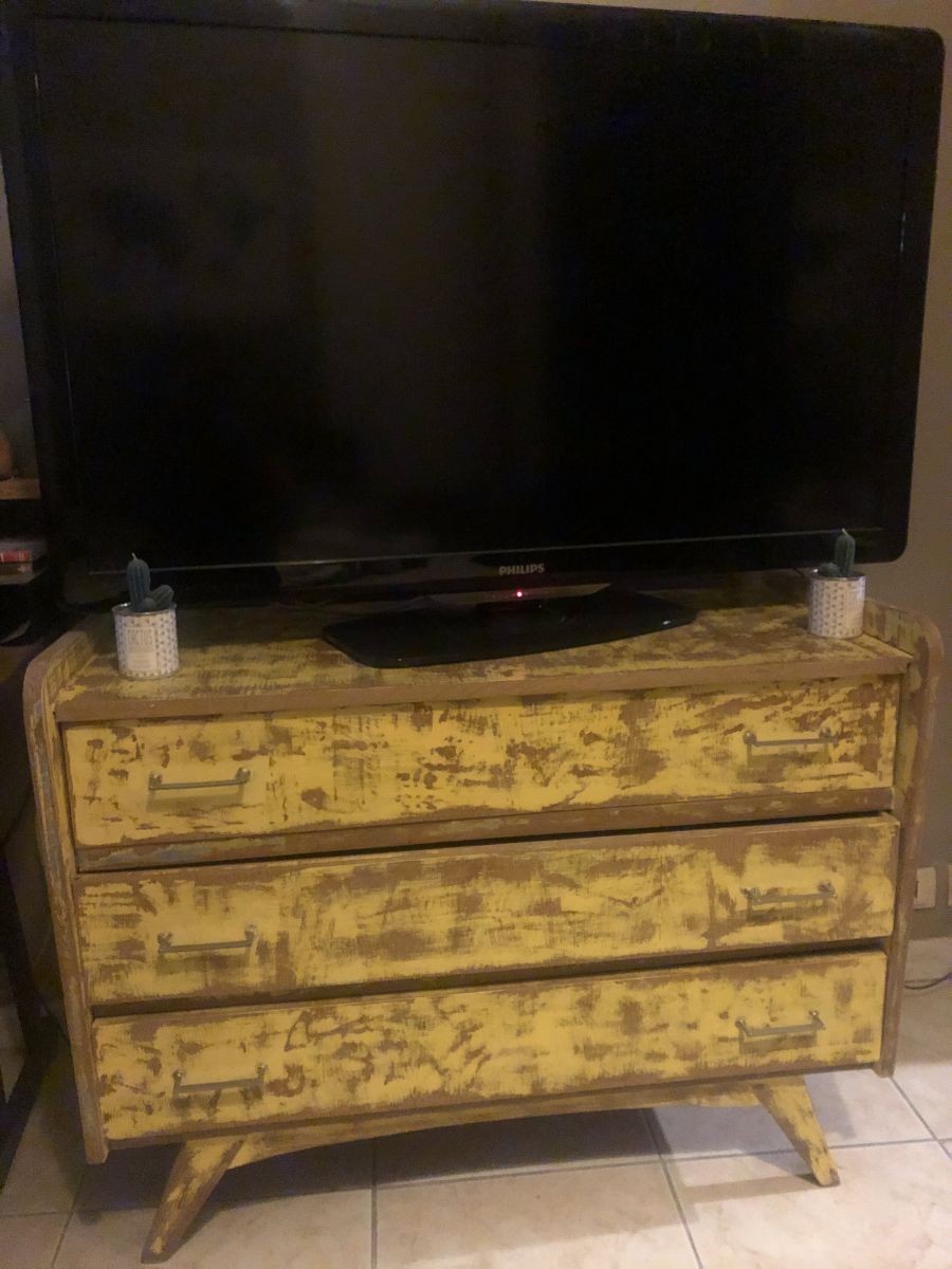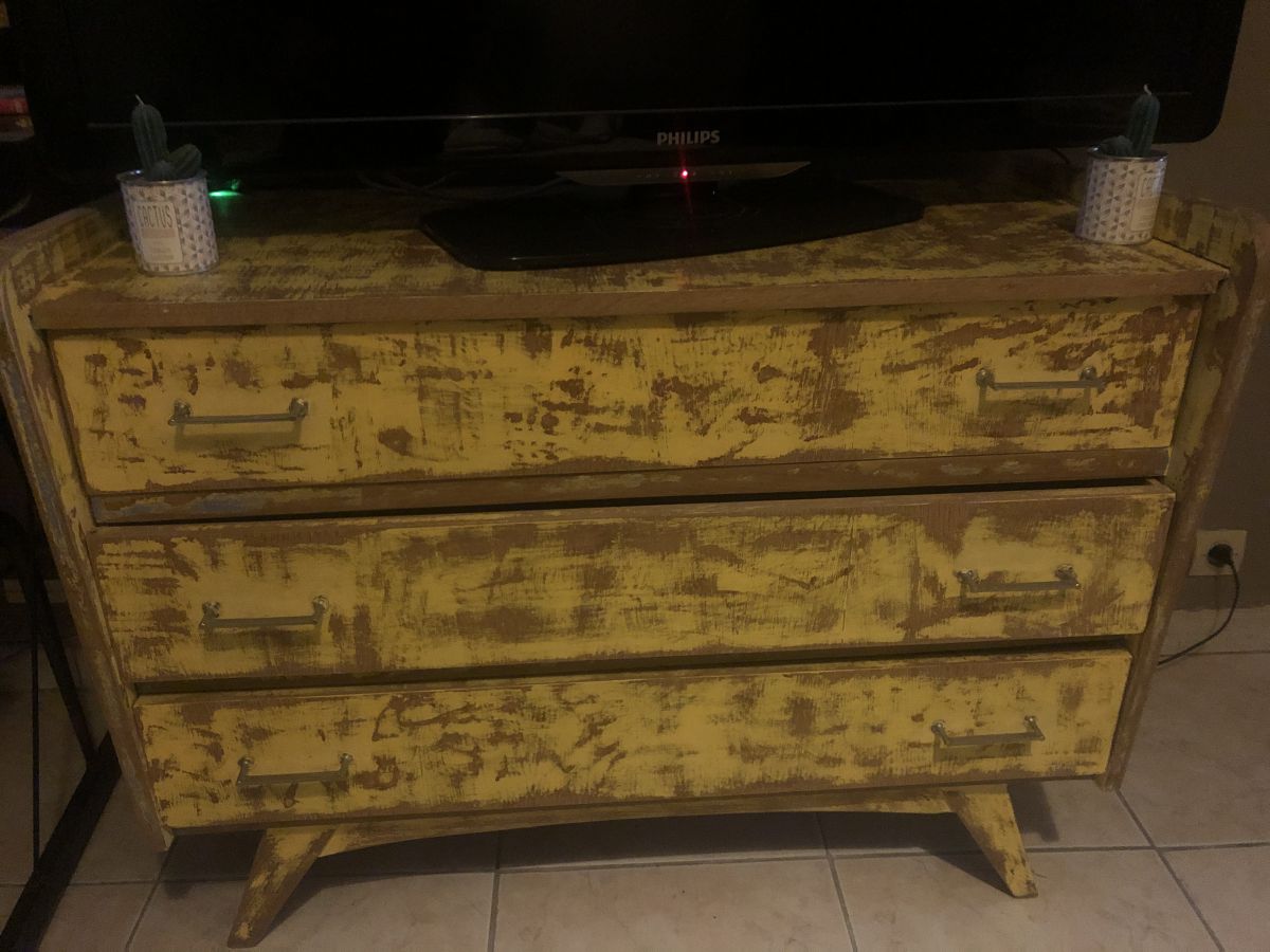 ce charmant meuble en bois patiné en jaune a été travaillé avec un effet très vieilli .