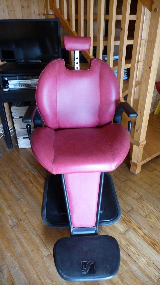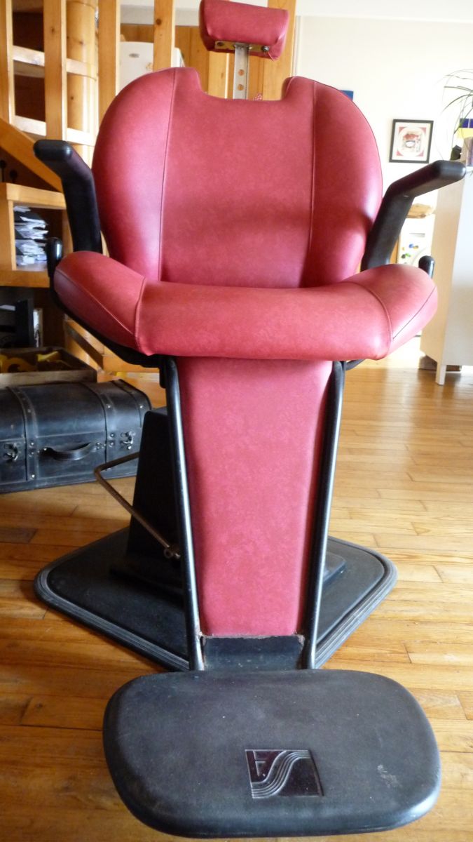 Superbe fauteuil de barbier, avec accoudoirs, appui-tête et repose pieds.