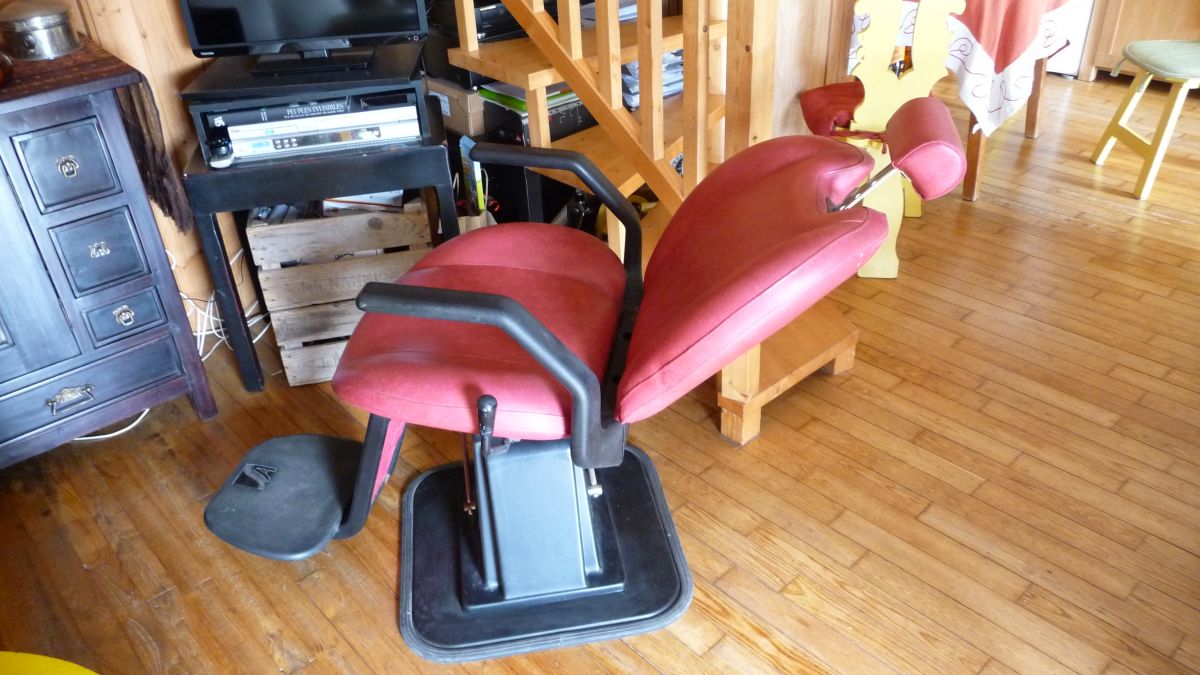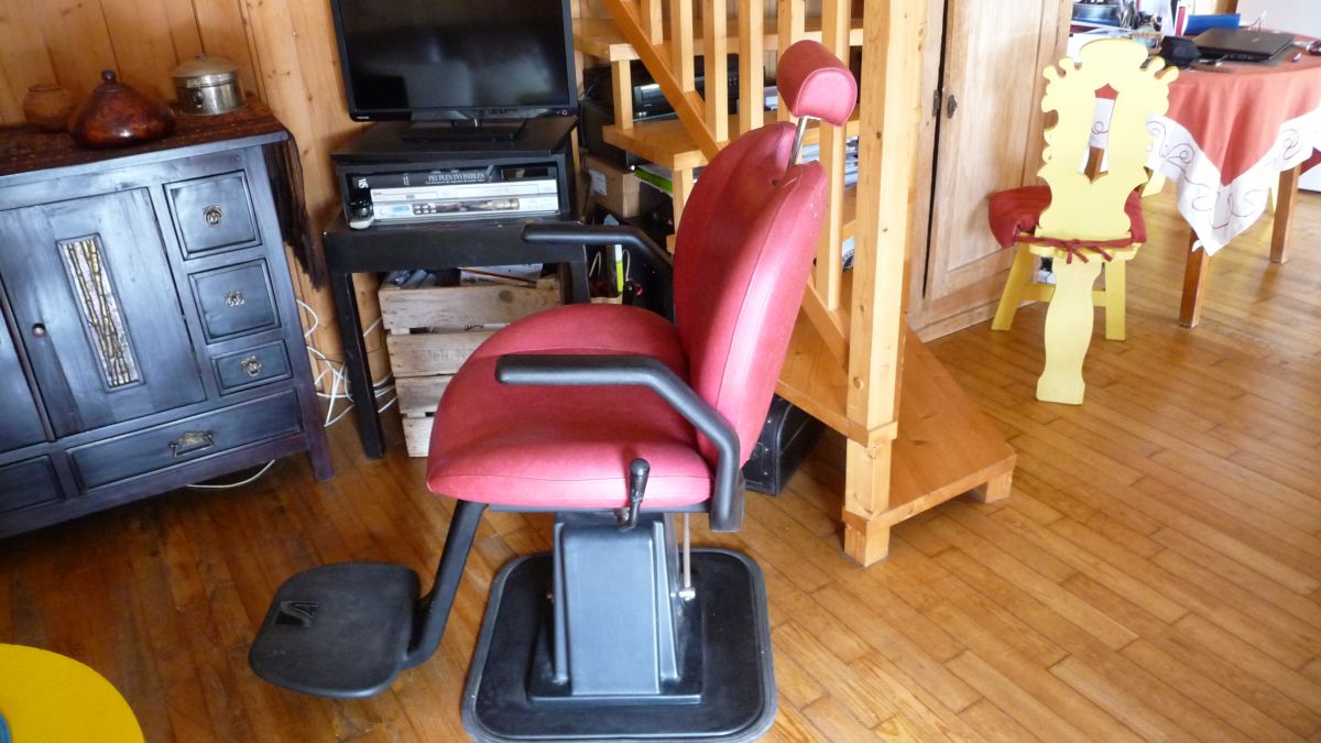 L'appui-tête est réglable en hauteur, le dossier est inclinable, le fauteuil tourne sur lui même. Le vérin, permettant de faire monter et descendre le fauteuil, grâce à une "pédale", est à réparer. Le fauteuil peut bien évidemment servir sans le vérin.