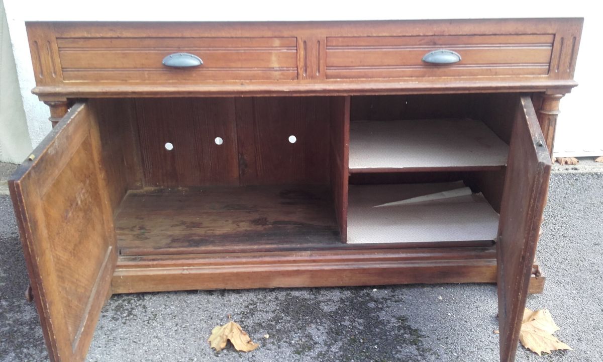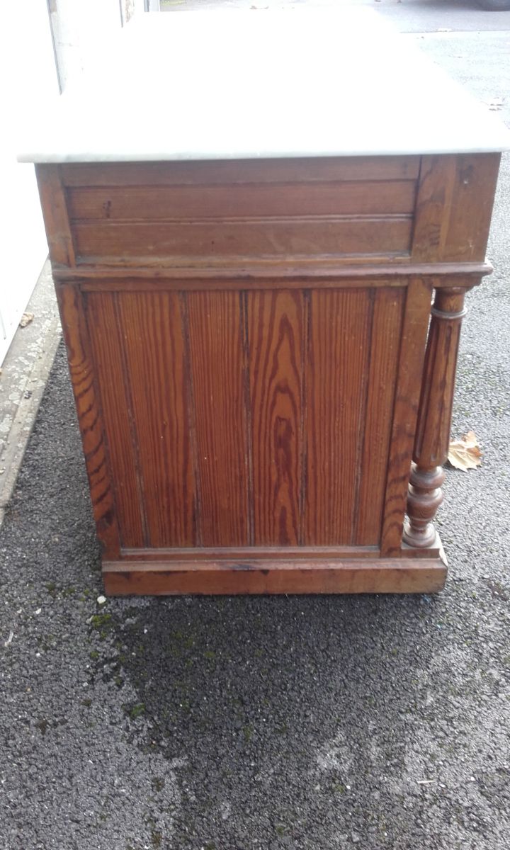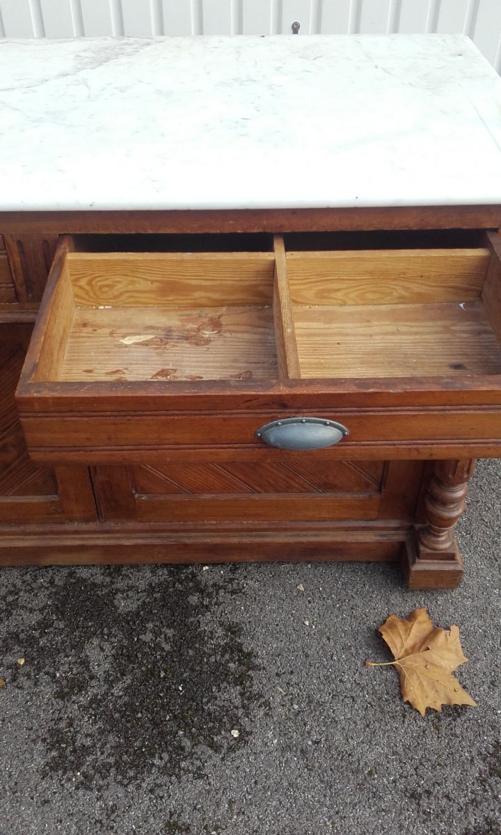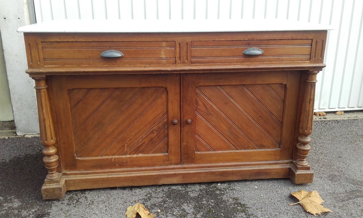 Magnifique bahut style campagne muni de deux tiroirs et tablettes de rangement avec un plateau en marbre blanc.Il a gardé quelques traces du temps.