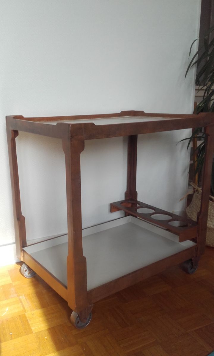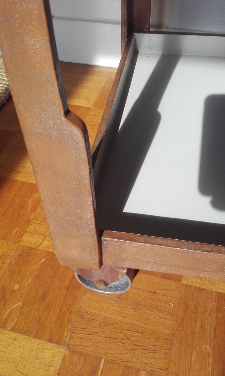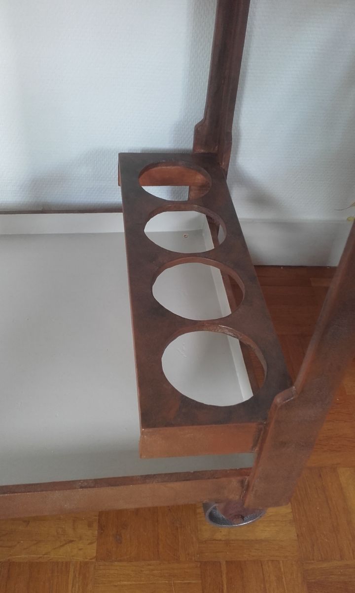 Desserte vintage rénovée en couleur lin pour les plateaux et couleur rouille,munie d un rangement pour quatre bouteilles,montée sur 4 roulettes effet rouille.