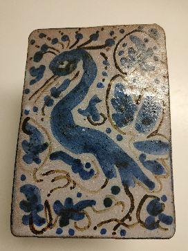 Boîte céramique fait main dans les tons bleu et gris avec un phénix peint sur le couvercle.