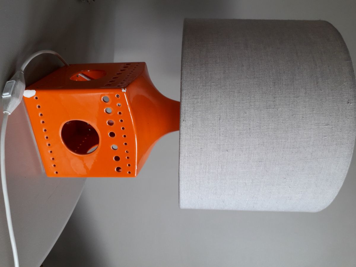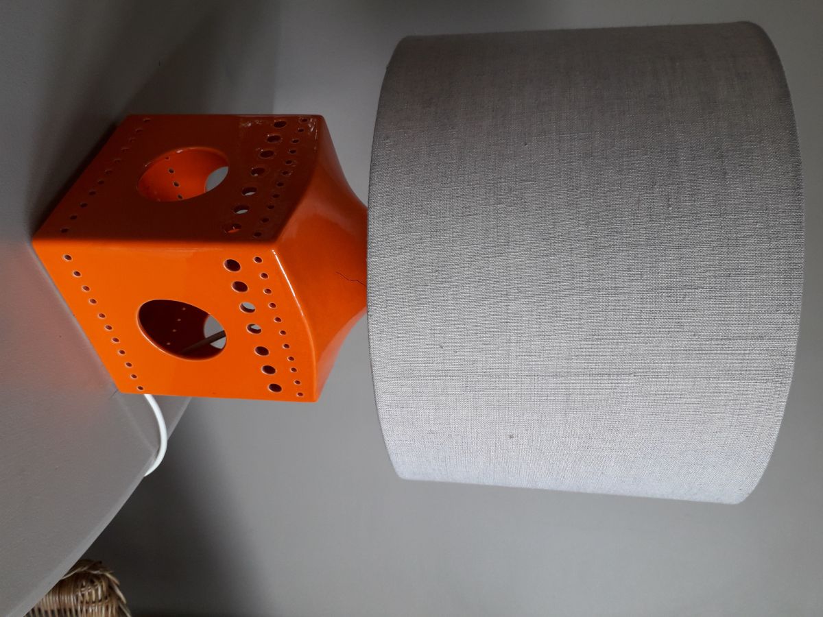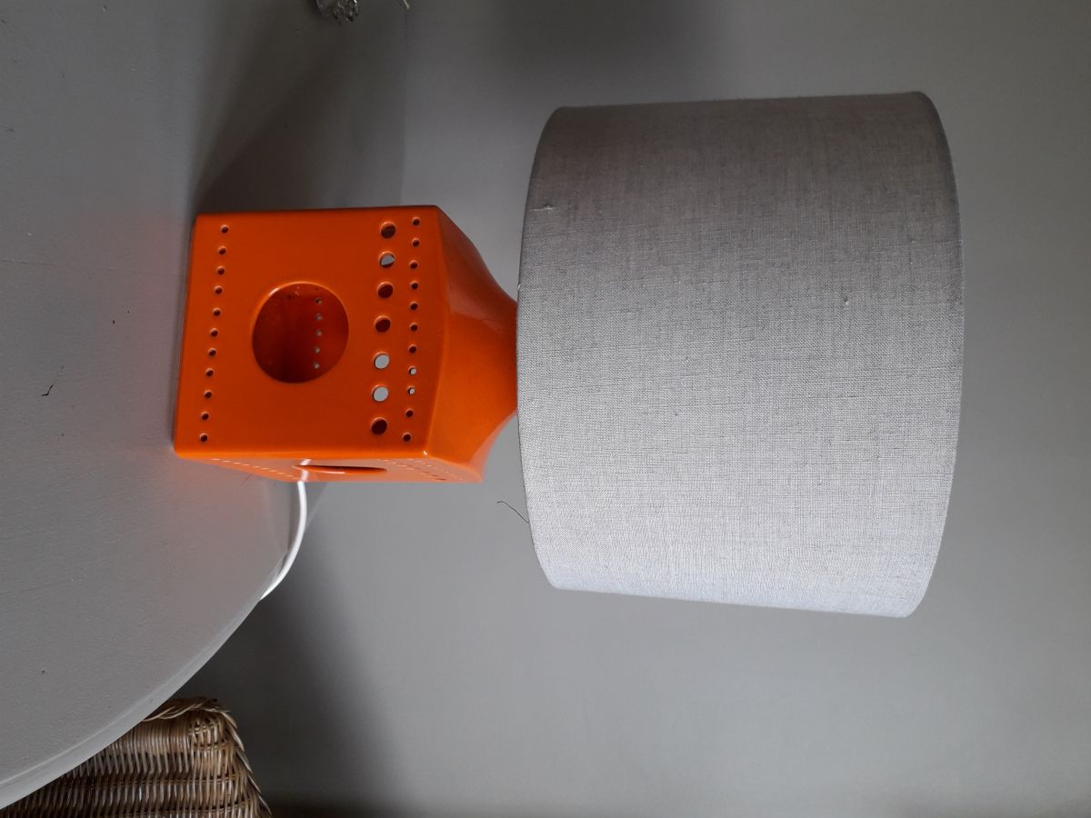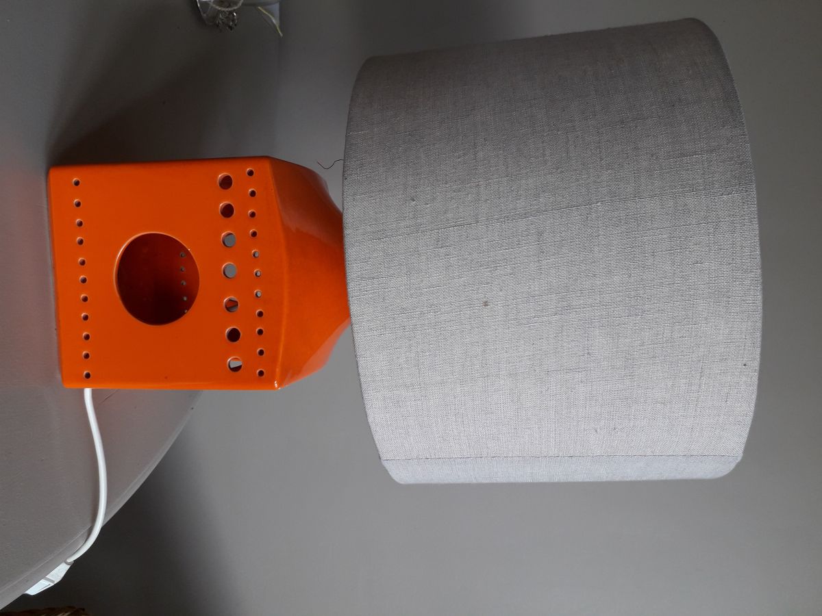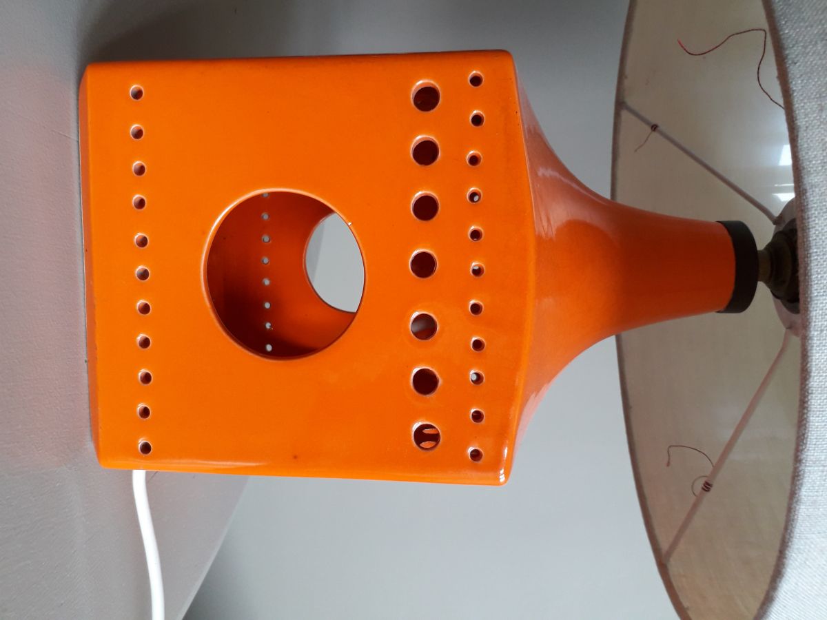 Lampe vintage des années 70 en céramique orange avec le pied de forme carrée et ajouré. Le pied de lampe est dans son jus et l'abat jour est en très bon état.
