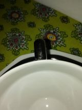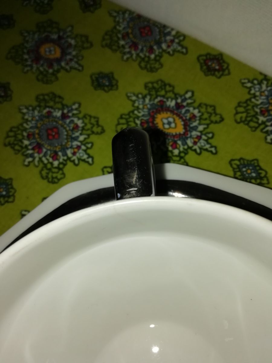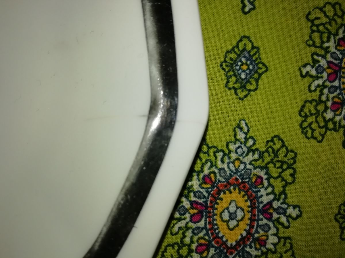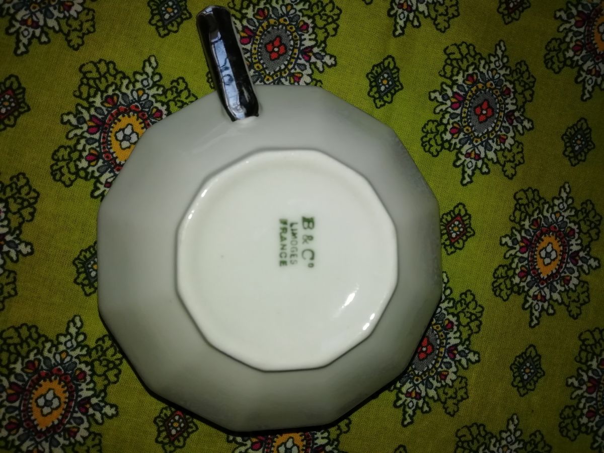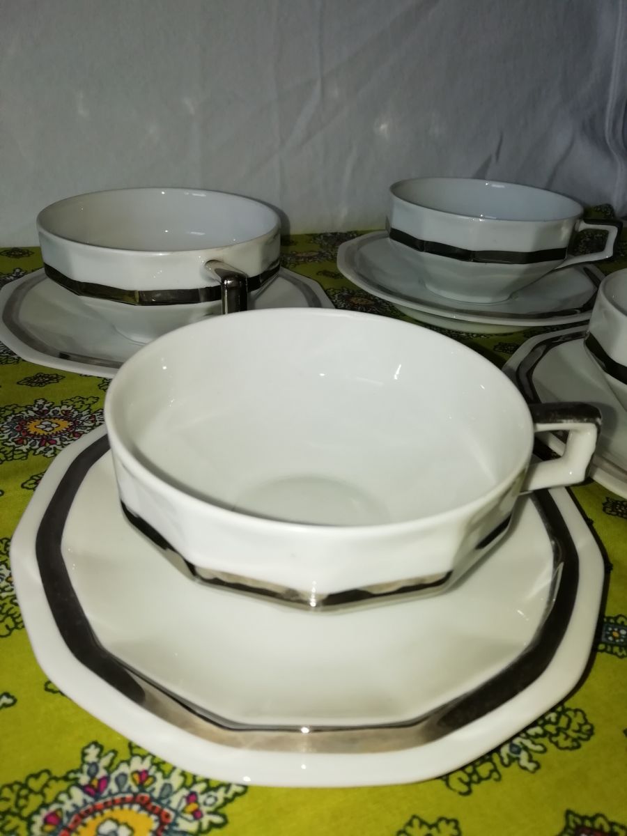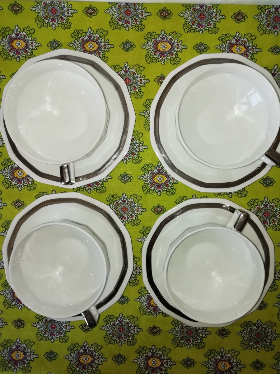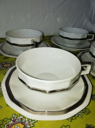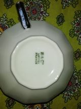 Le liseré argenté est usé à certains endroits, une fêlure peu visible sur une soucoupe et une autre également peu visible sur une tasse voir photo.