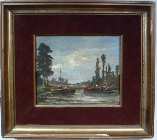 Oil on wood representing two boats berthed on a river with a pastoral background