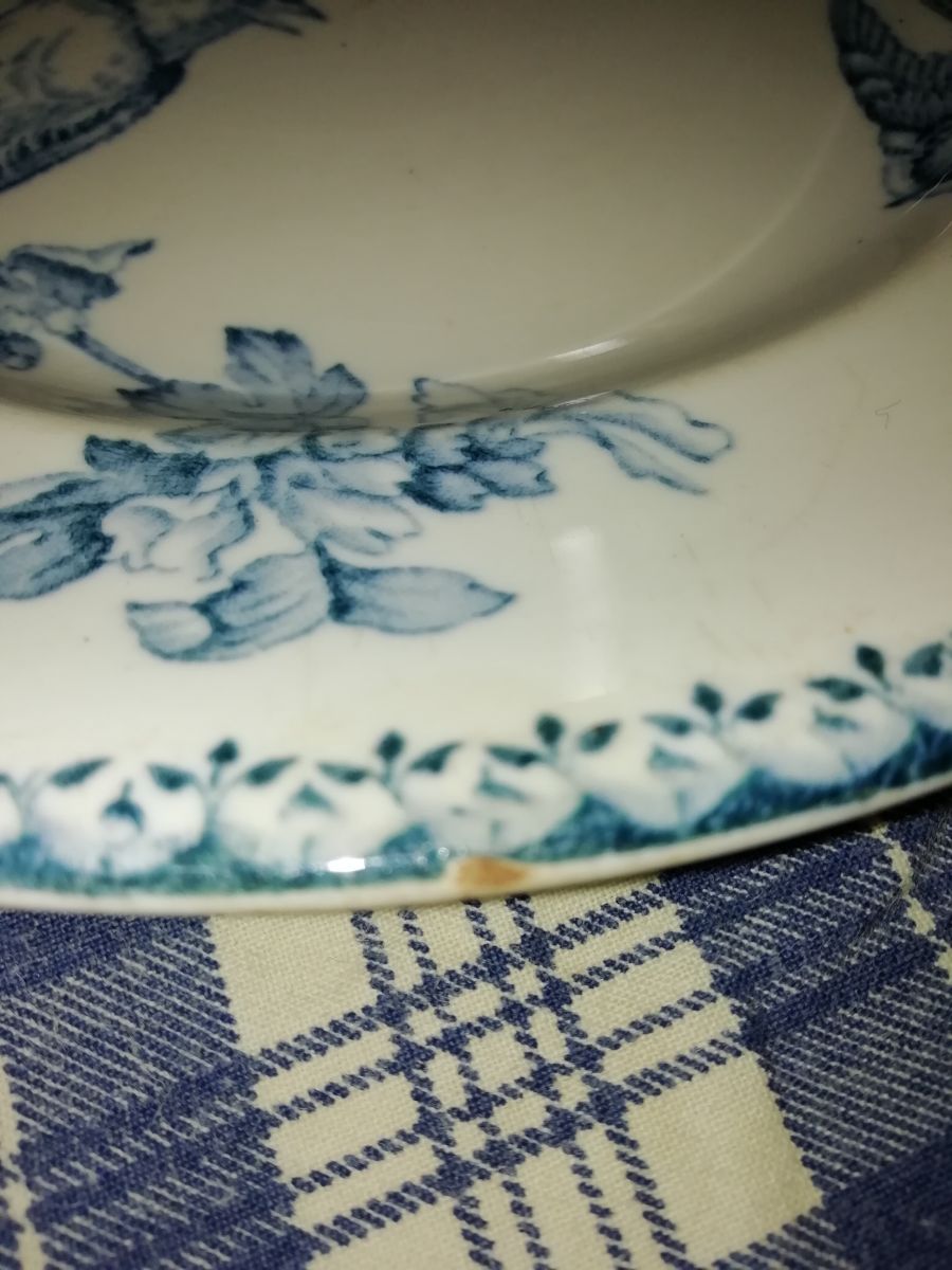 Quelques petites aspérités du temps sur les bords (plutôt vers l'arrière ce qui ne se voit pas sur la face de l'assiette). Référence photos.