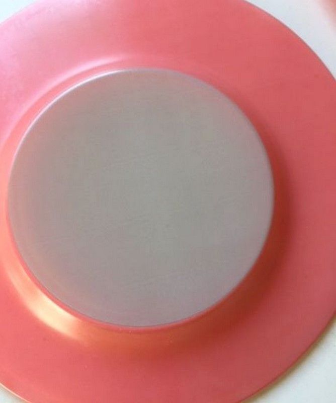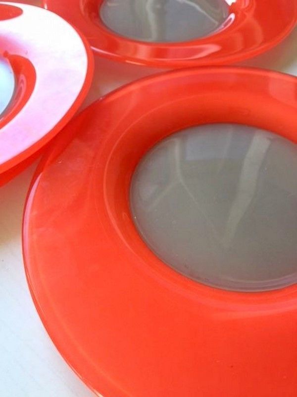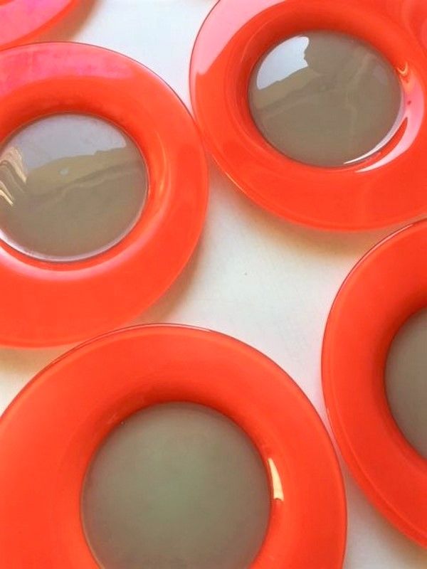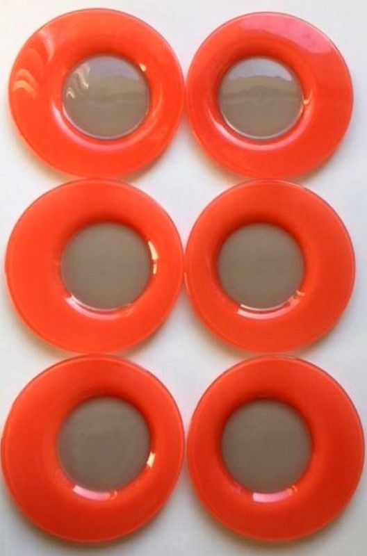 Lot de 6 assiettes en verre de coloris orange, centre décalé blanc mat.