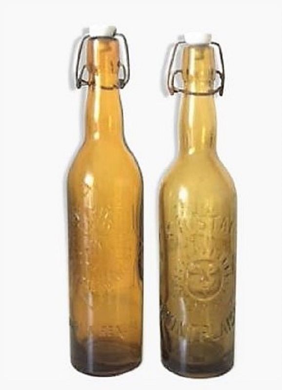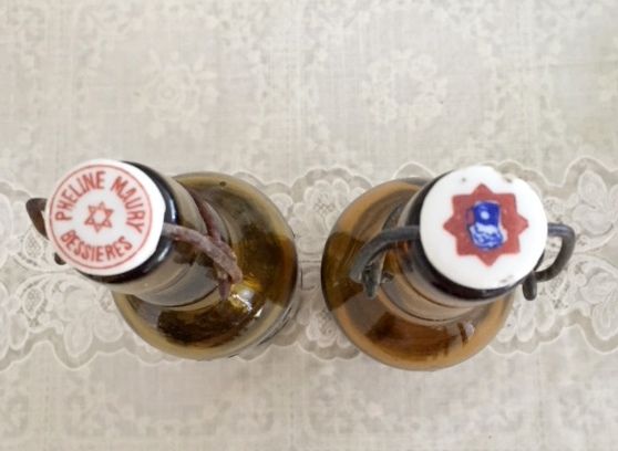 Lot de 2 Bouteilles en verre ambré épais transparent estampillées, bouchon en porcelaine.