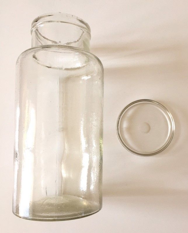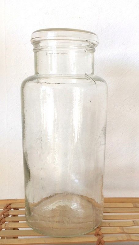 Grand flacon XXL, bocal ancien en verre moulé translucide, légèrement épais, avec couvercle.