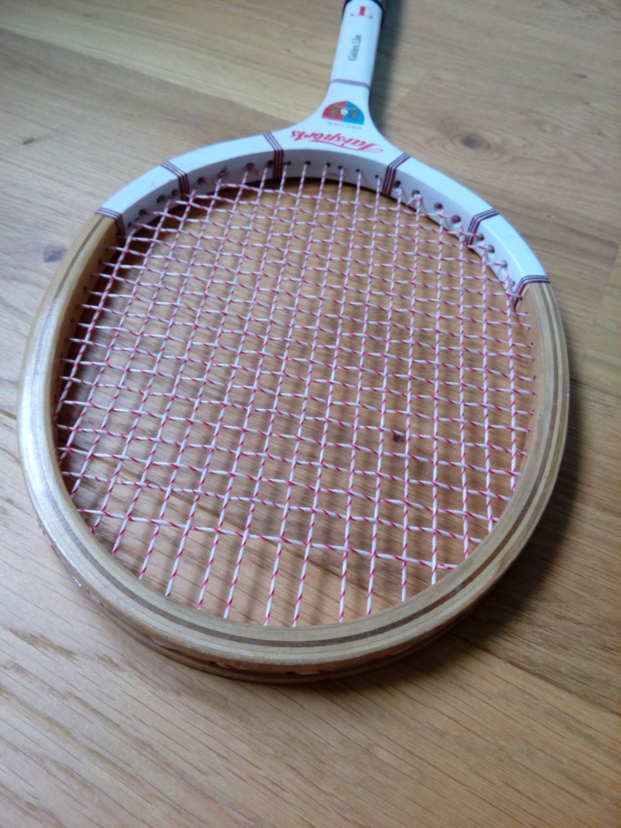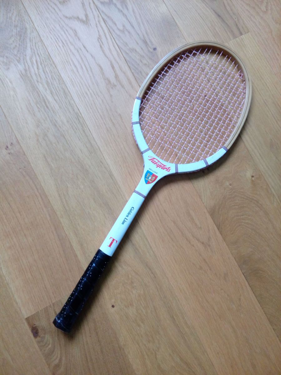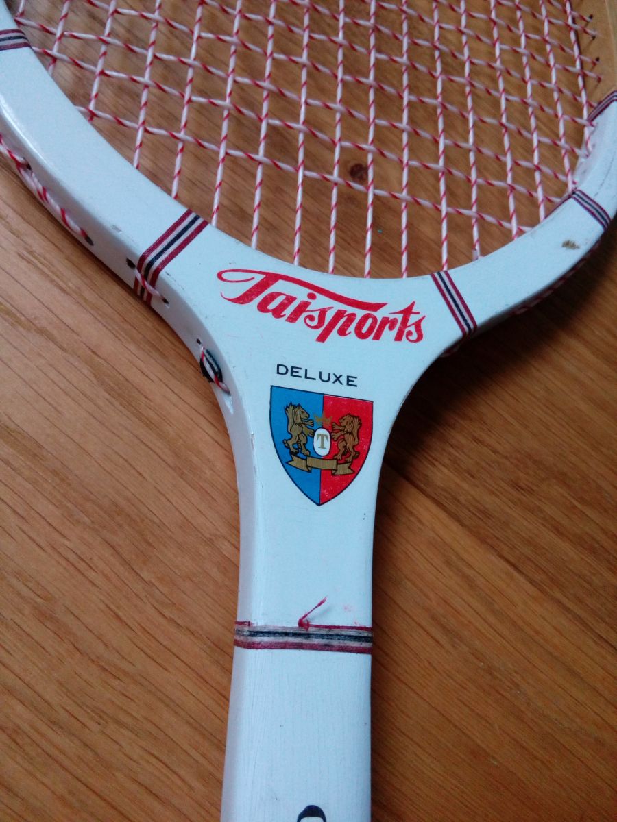 Charmante raquette vintage qui doit dater des années 70 ou 80 car le cadre est encore en bois, mais le cordage est déjà synthétique, pas de boyau donc; ) parfait pour une déco vintage et utile si vous y accrochez vos boucles d'oreille par exemple. Elle est de marque Taisports et porte les mentions : Taisports deluxe golden lion ainsi qu'un joli écusson à deux lions. Elle est en très bon état vu son âge, ses couleurs sont encore vives, mais elle comporte quelques marques du temps : taches, rayures...le grip est en bon état, bien fixé (3 agrafes en bas du manche). Elle mesure 66 cm de haut, 23 cm de large et 1, 5 cm d'épaisseur et pèse 320 g.