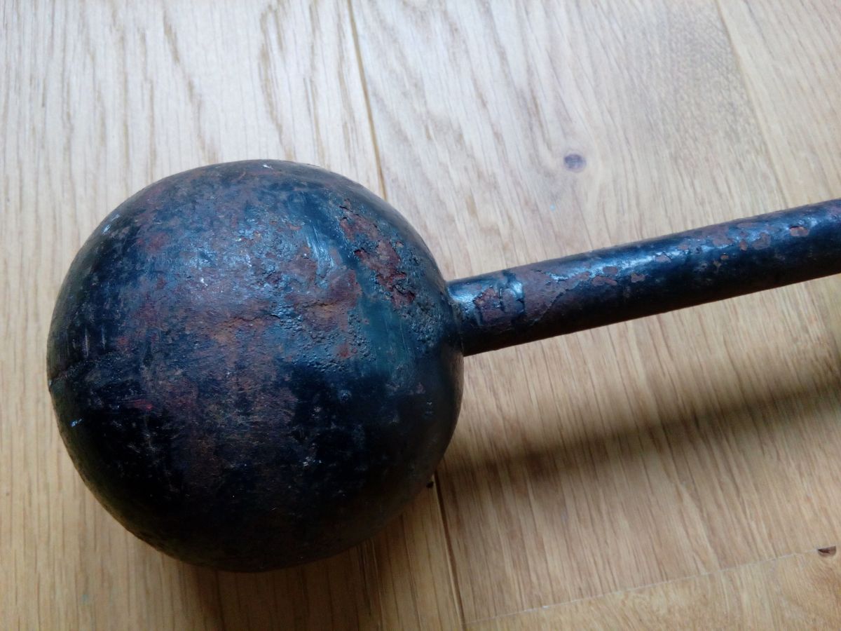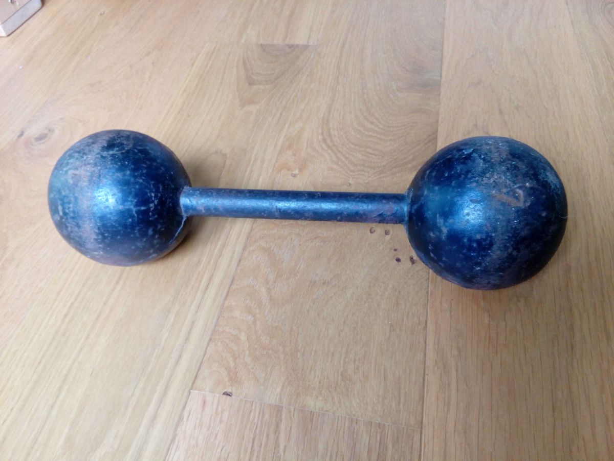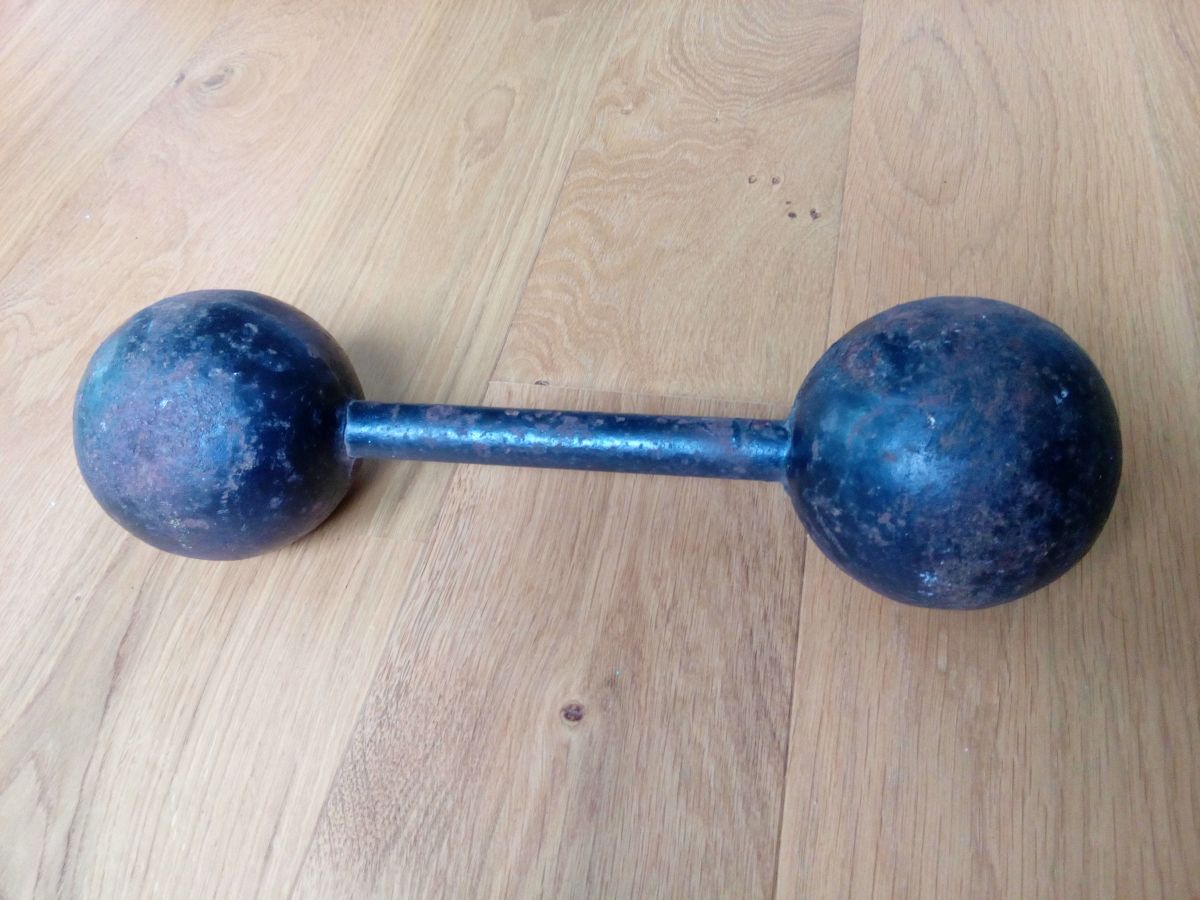 Haltère en fonte peinte en noir de 7 kg avec une jolie patine, elle doit dater des années 50. Elle est dans son jus, avec des marques d'usure et d'usage diverses : traces de coups, rayures, taches, rouille qui a bien attaquée le métal, et peinture noire d'origine, largement entamée. Il y a un marquage «7 » sur chacun des « poids ». Elle mesure 33 cm de long, et le diamètre des « poids » est de 9, 5 cm.