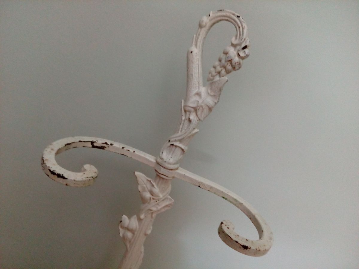 Ce joli porte-parapluie ( ou porte-cannes) en fonte date des années 60. Il est joliment décoré de plantes grimpantes (on dirait de l'ipomée), fleurs, fruits, feuilles... Il est encore solide mais présente la patine de son âge : la pointe d'une feuille de la plante grimpante est cassée (pas très visible), des manques nombreux sur la peinture, des taches de rouille. Il y en a pas mal aussi en sous-face du réceptacle, mais cela ne remet pas en cause la solidité de l'ensemble, c'est une bonne couche, mais qui reste superficielle. Il mesure 66 cm de haut, le réceptacle mesure environ 26 cm de large pour 23 cm de profondeur. Ce porte-parapluie pèse environ 5 kg.