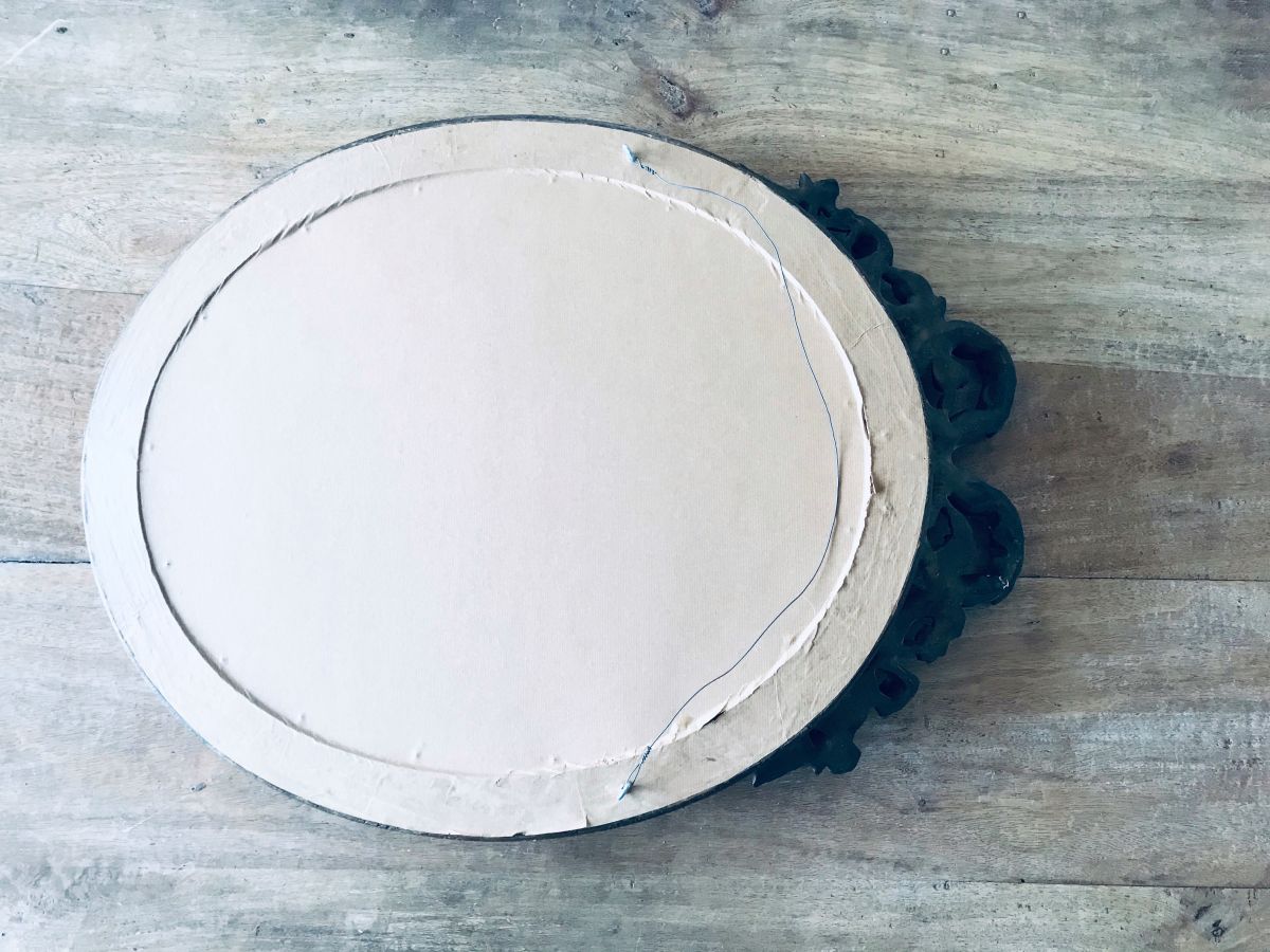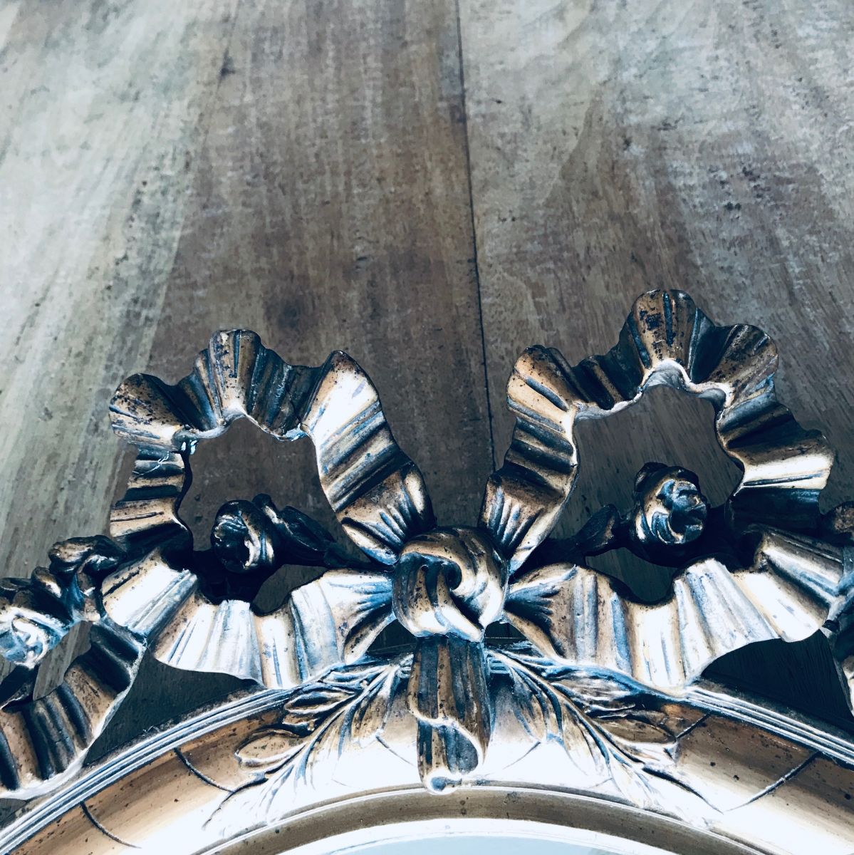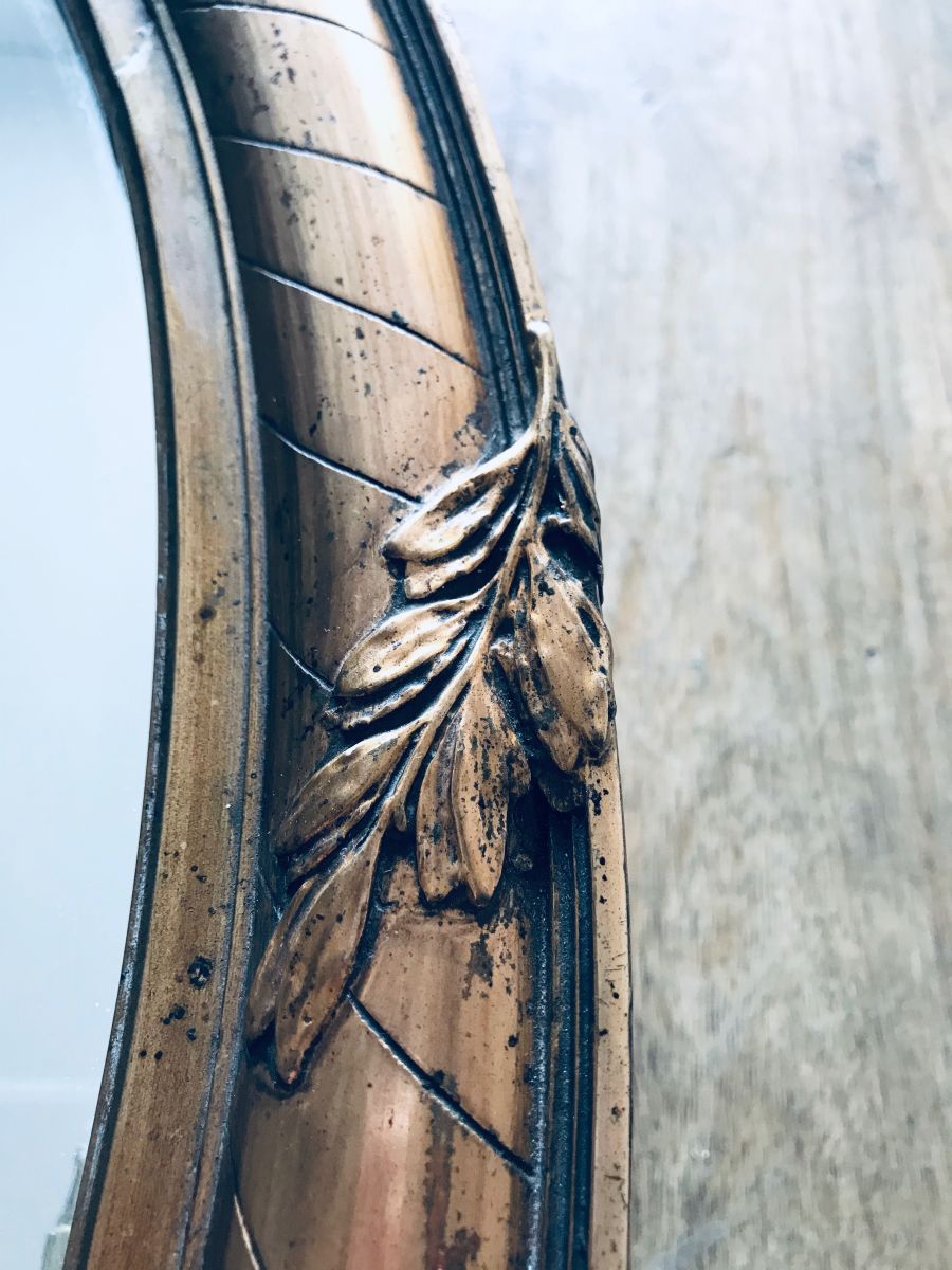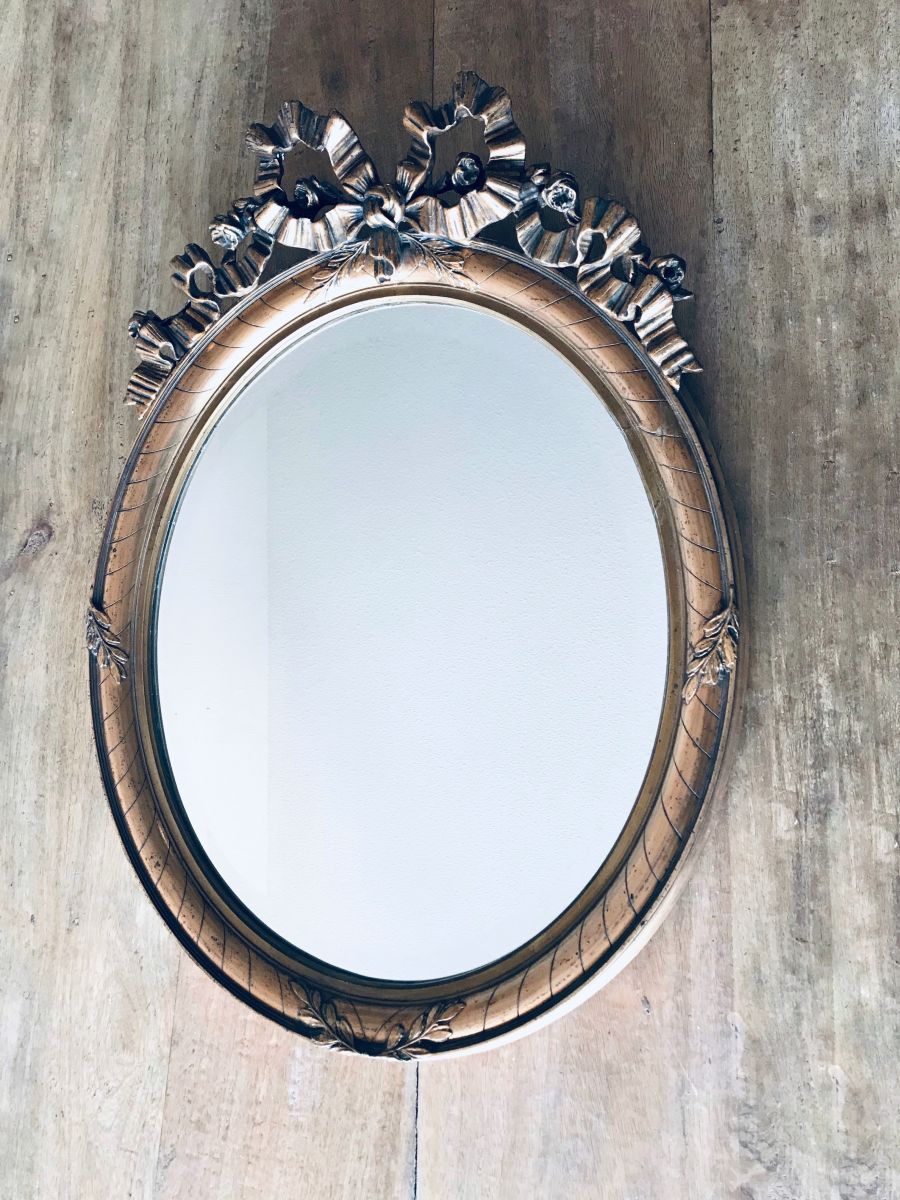Le moins que l’on puisse dire est que ce miroir est imposant et charismatique, il attire l’attention et est capable à lui seul de décorer une pièce ! Ce splendide miroir ovale date des années 1900, il est en stuc et bois, le cadre est surmonté d’un joli et large noeud orné de fleurs. Le pourtour est délicat et plus sobre quelques feuilles sont apposées aux quatre points cardinaux. La vitre est biseauté et au mercure, d’une belle réalisation dont l’état est impeccable. L’encadrement est d’une belle couleur bronze doré. Que dire de plus, si ce n’est un petit accident visible au dos d’un noeud qui passe inaperçu à l’avant.