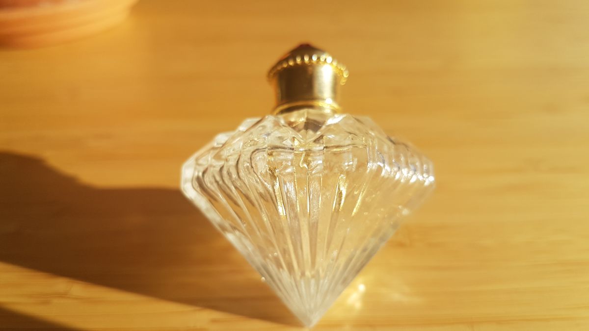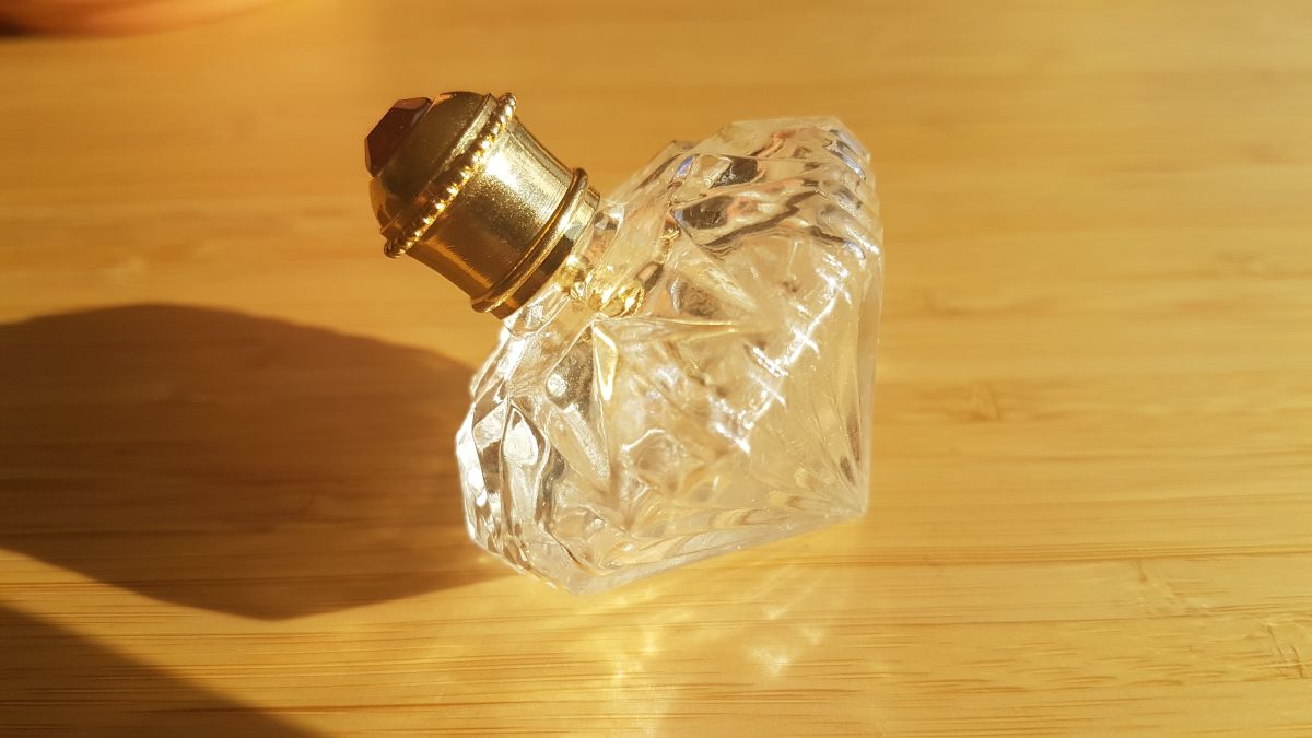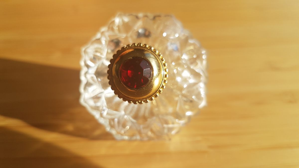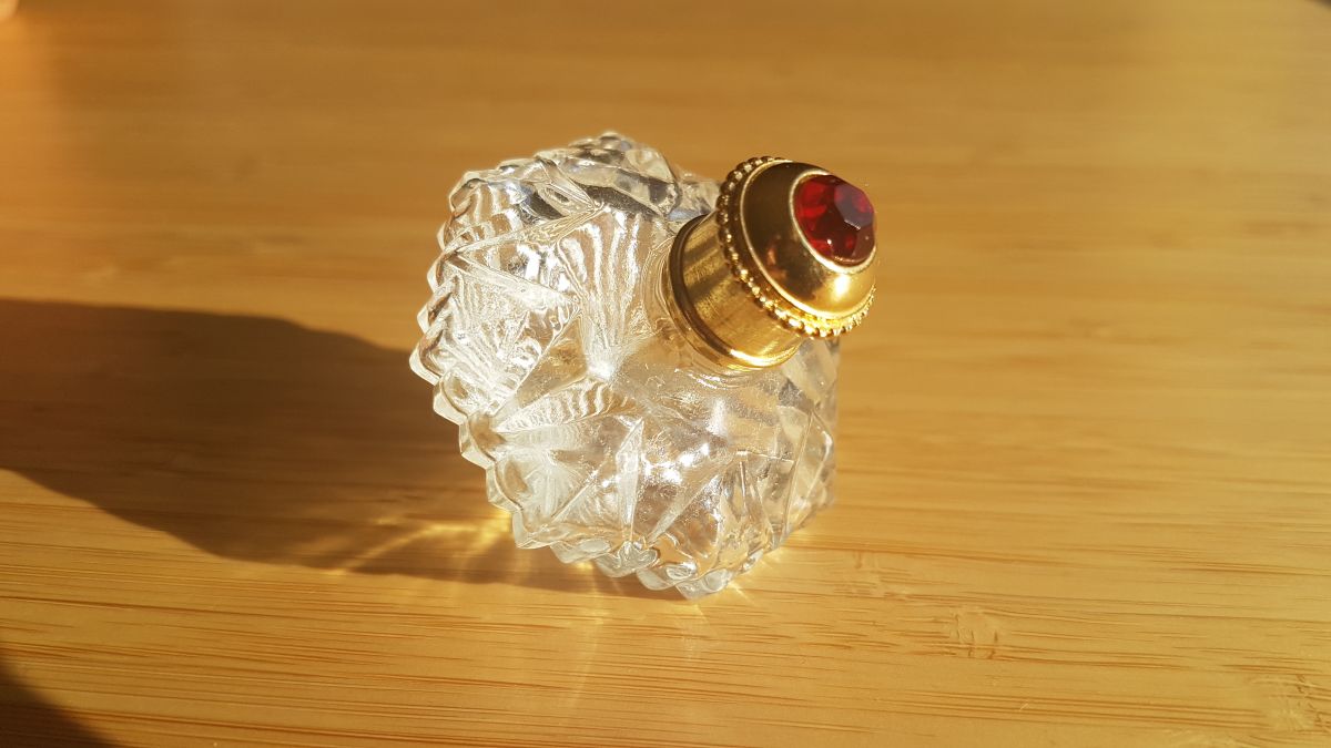 Flacon de parfum en verre taillé avec bouchon doré serti d'une pierre rouge. État bon .