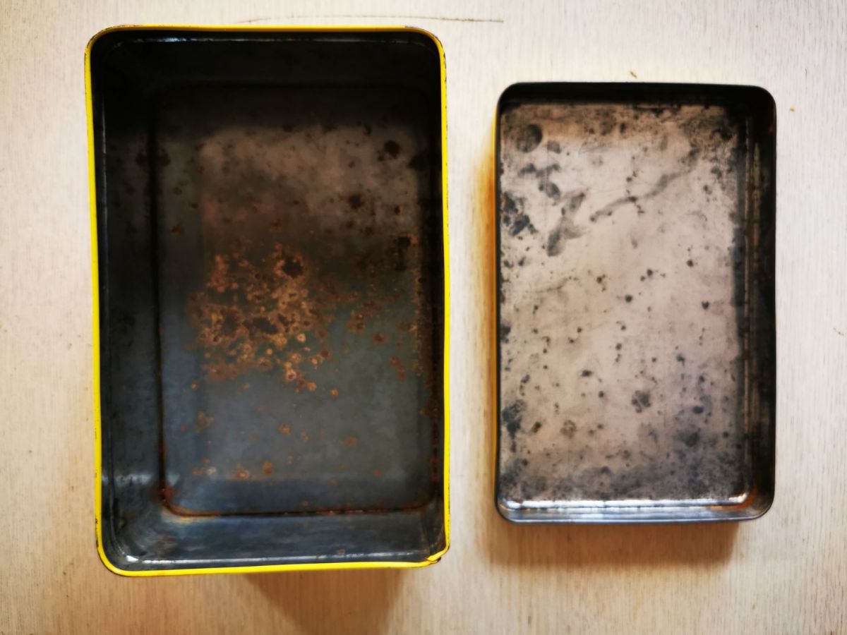 La boîte à été nettoyée, l'oxydation du métal retirée et un vernis anti rouille déposé.
