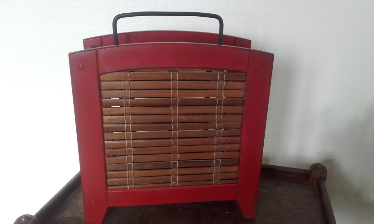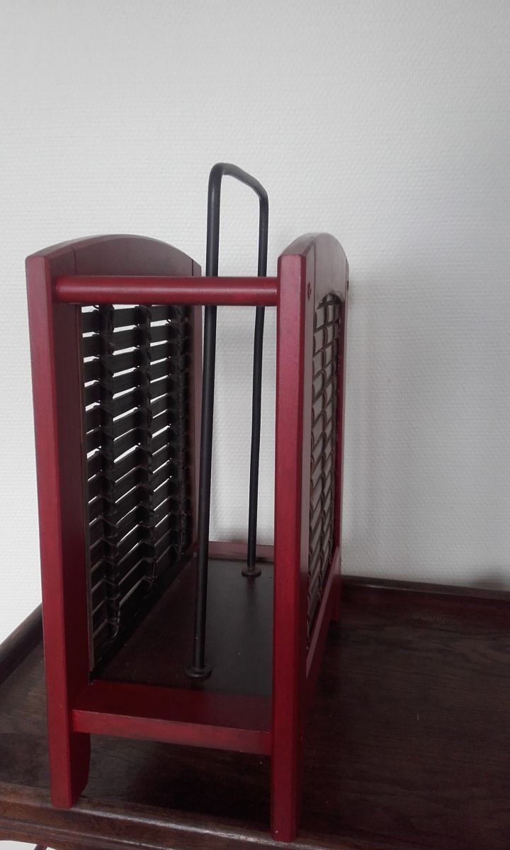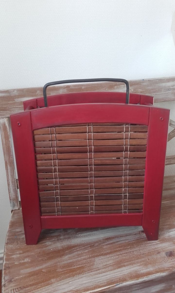 Porte revues vintage en rotin et bois rénové couleur Bordeaux et patiné.
