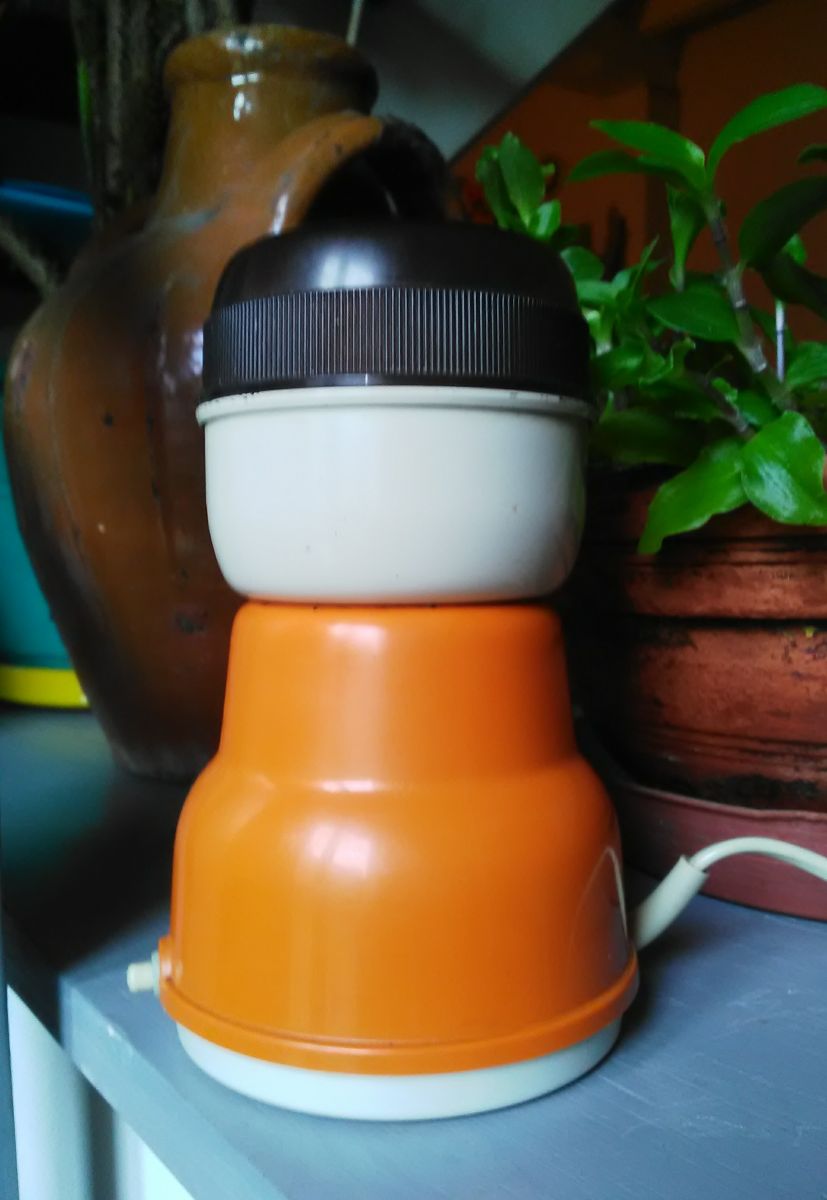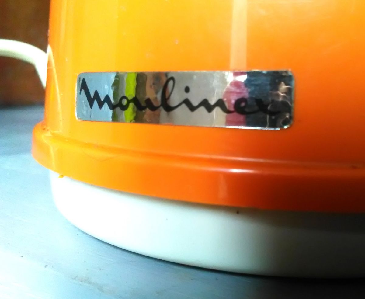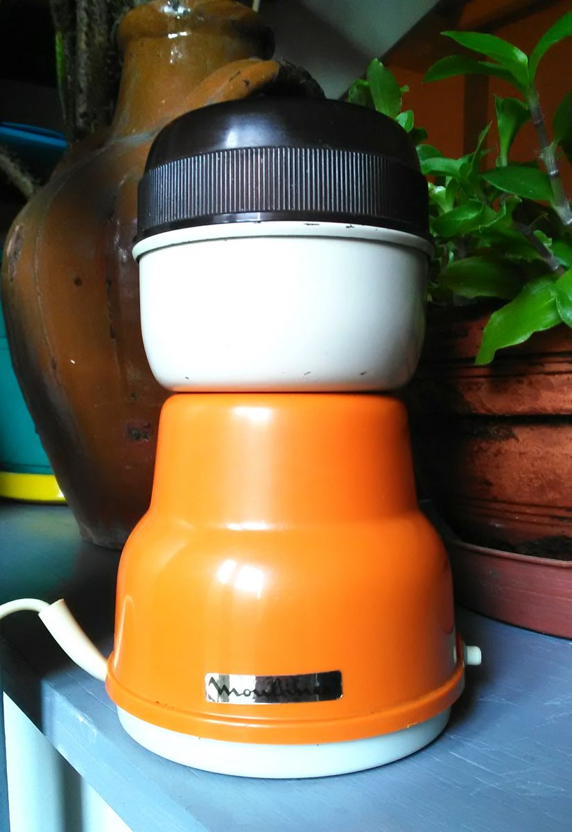 Moulin à café électrique emblématique avec sa couleur orange de la marque française Moulinex