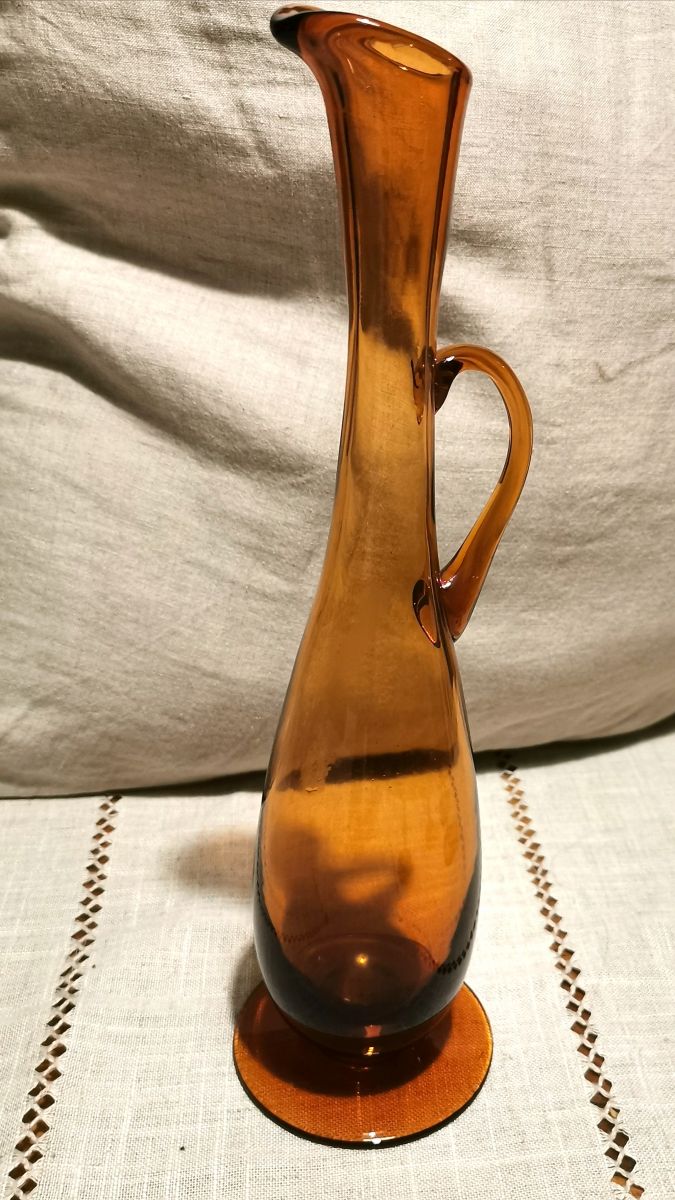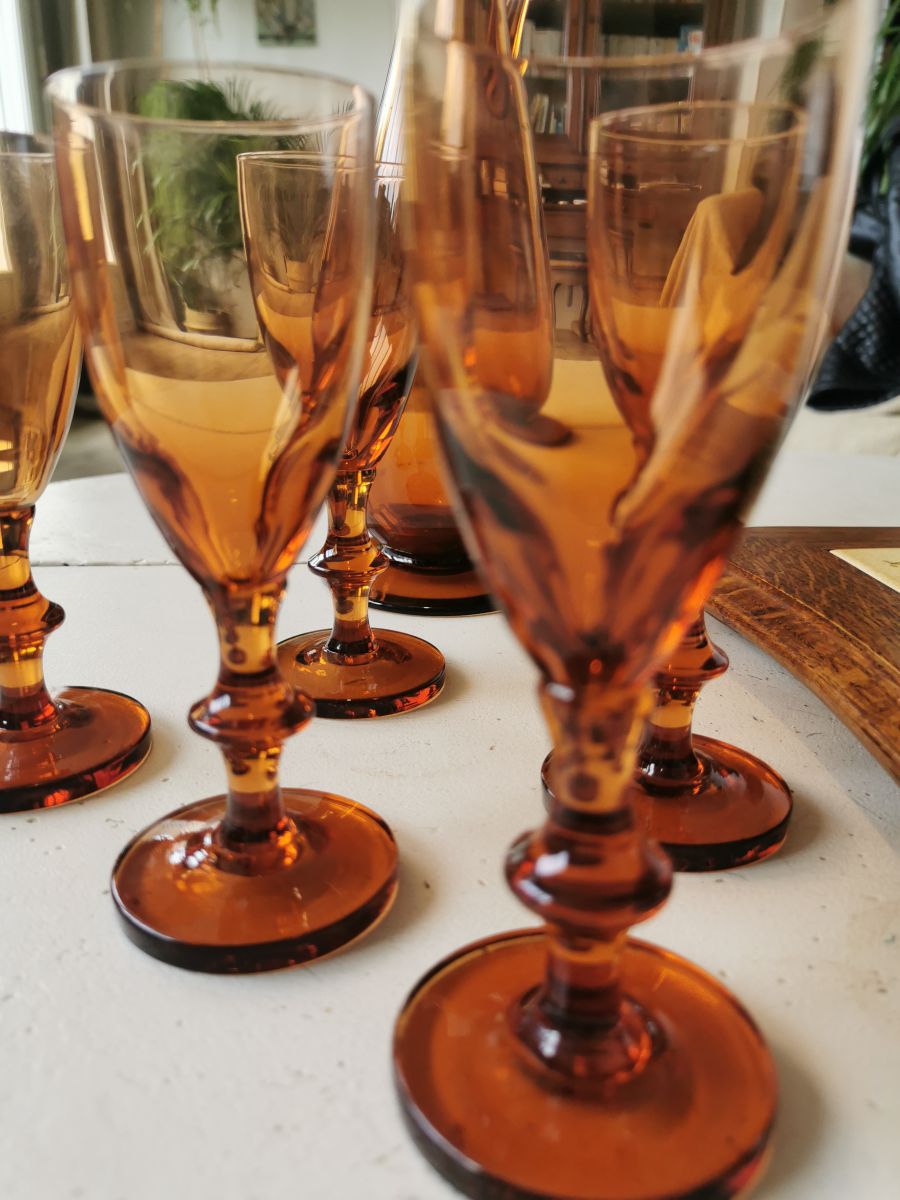 Ensemble carafe et ses cinq verres d'un magnifique coloris ambré.