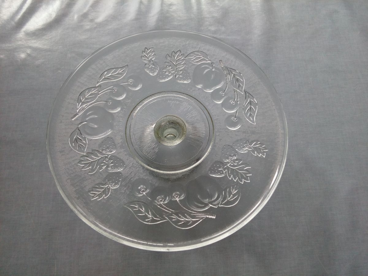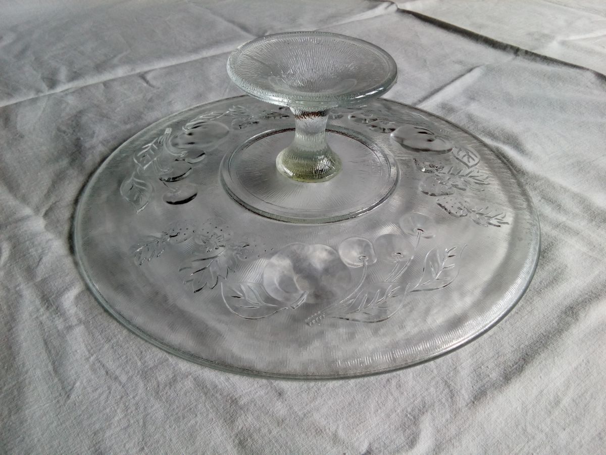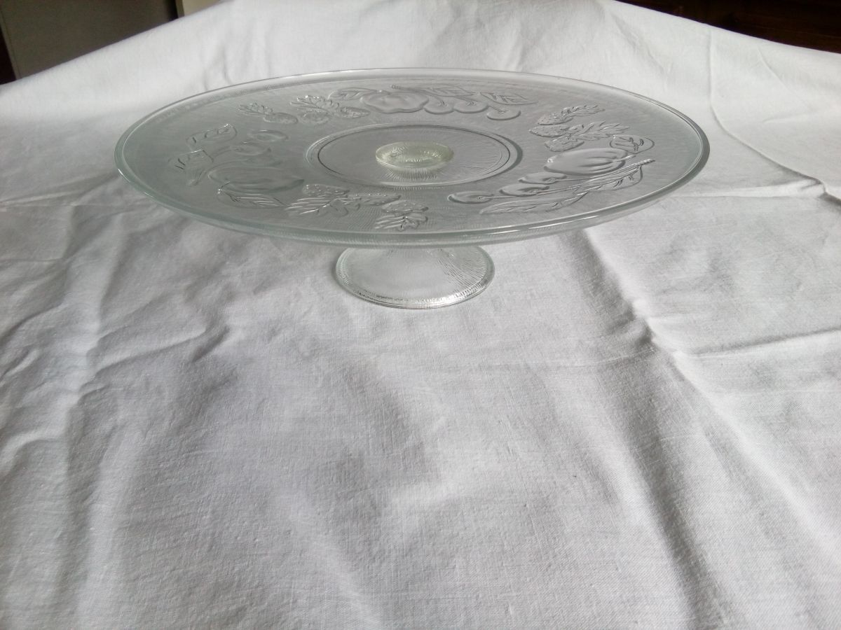 Joli plat présentoir rond en verre sur pied. Le dessus du présentoir est lisse pour accueillir tarte, quiche ou gâteau, le dessous présente un décor de fruits en relief. Il est en bon état, on observe une légère coloration entre le pied et le plat, jaunâtre, mais bien moins en réalité que sur les photos (où le reflet vert vient de la couleur des murs de ma cuisine je suppose). Il mesure 31 cm de diamètre et 9 cm de haut. Il pèse environ 1,2 kg.