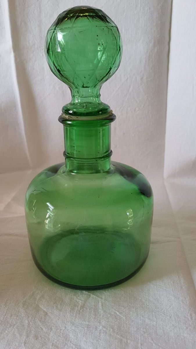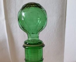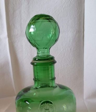 Superbe bouteille ancienne en verre d'Empoli. Bouchon travaillé avec façettes. Design milieu du XXème siècle Signé Made In Italie VE (Vetreria Etrusca).