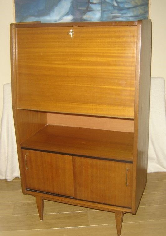 Petit secrétaire vintage de hauteur 1m20 qui peut donc se loger facilement. Celui-ci ferme à clé, très propre, deux étagères amovibles. Le vinyl jaune est d'origine. Ce secrétaire est en bon état voire très bon vu son âge: à noter un pied a été renforcé par son ancien propriétaire. Les portes du bas sont coulissantes.