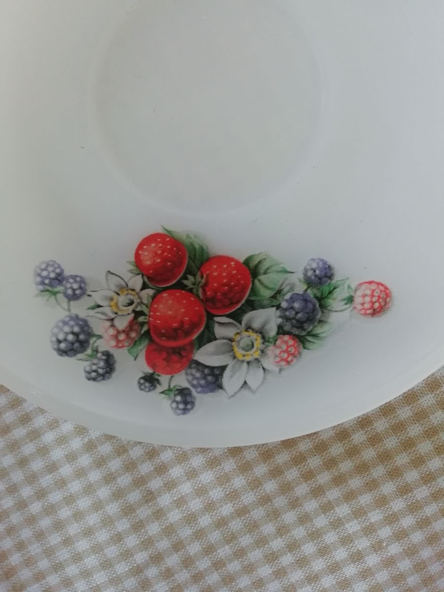 4 tasses opaline motif "fruits des bois" d'Arcopal, diamètre des tasses: 8,5 cm, hauteur:5 cm, diamètre des soucoupes:12,5 cm.