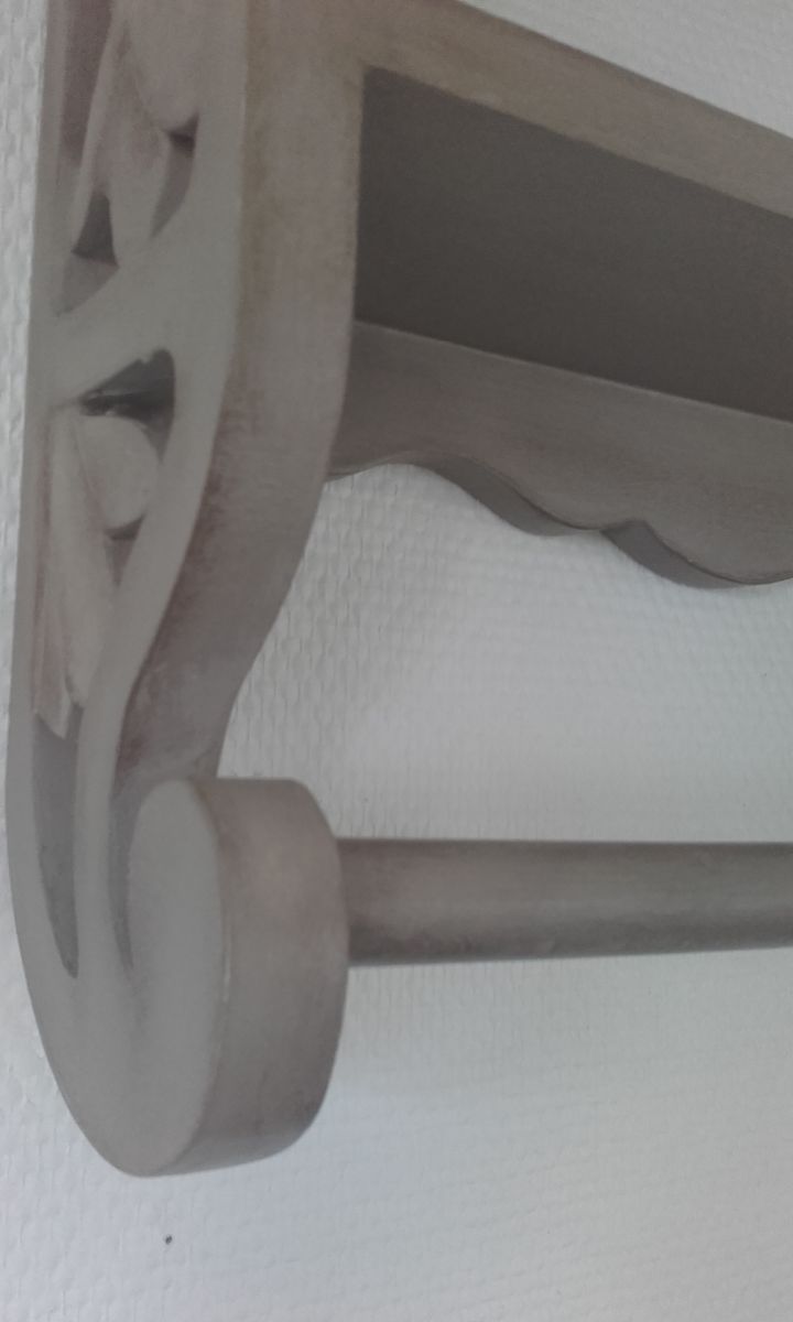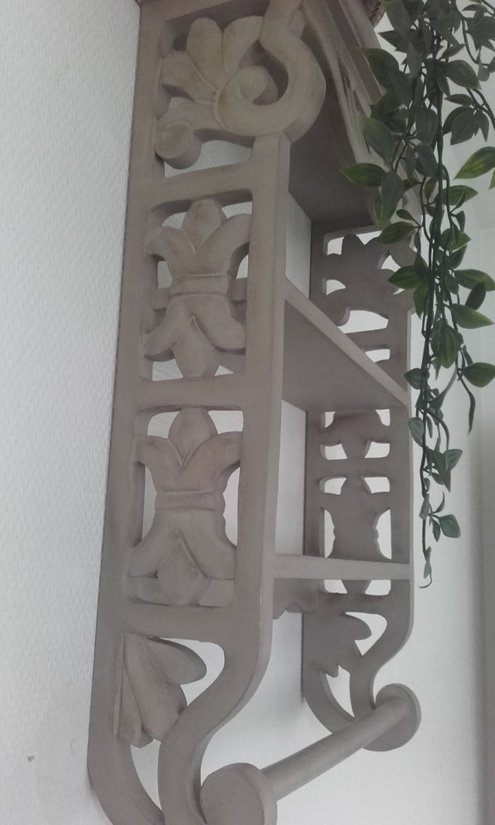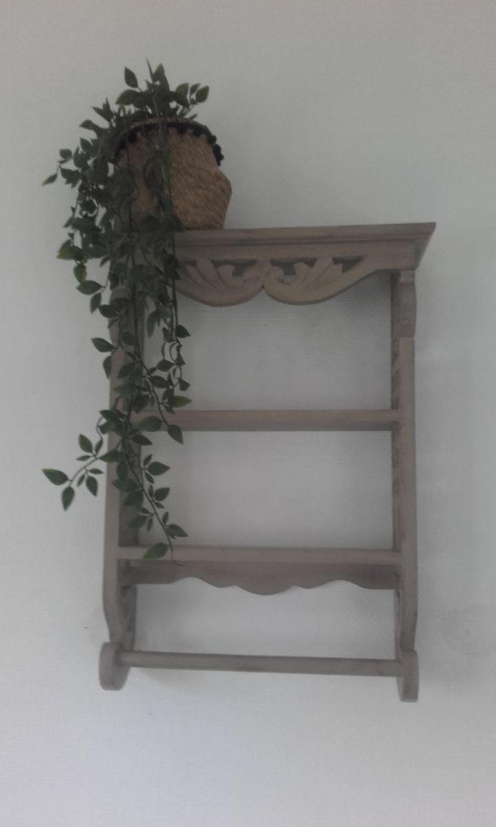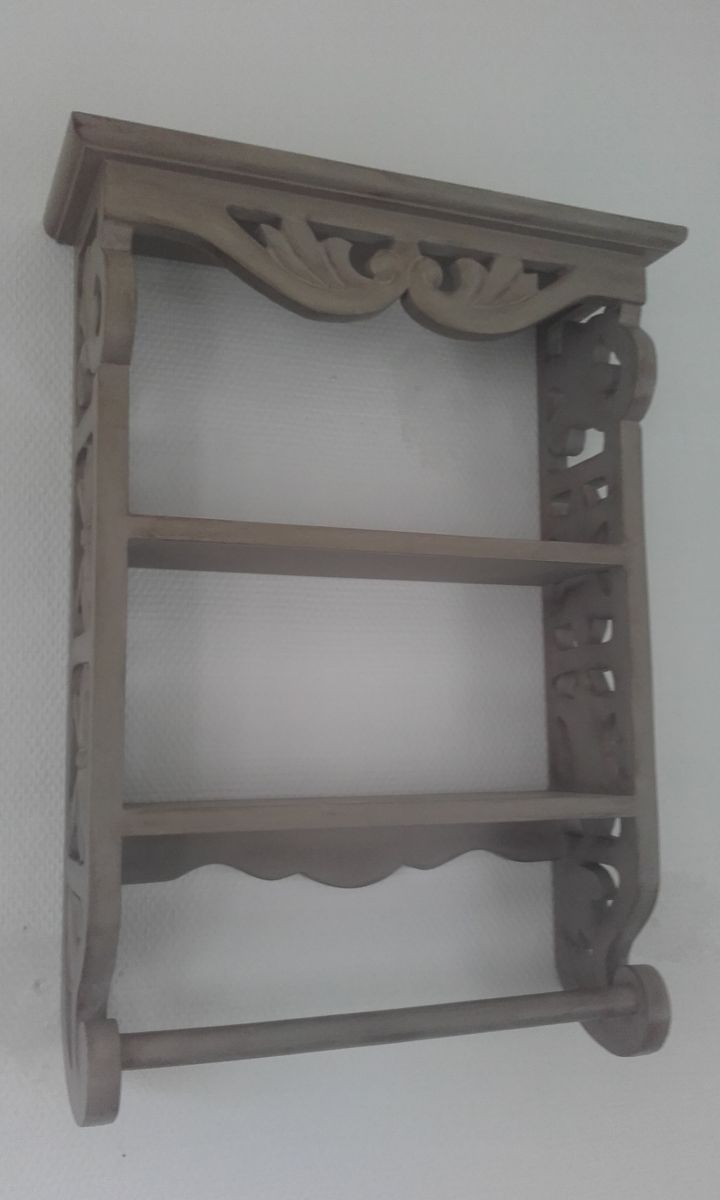Belle étagère en bois couleur lin avec un effet vieilli.