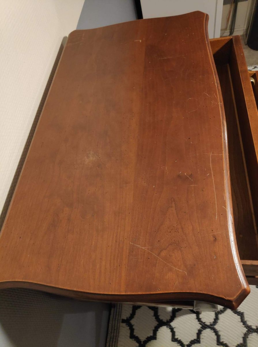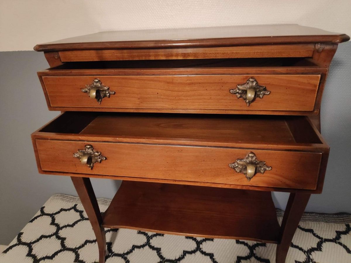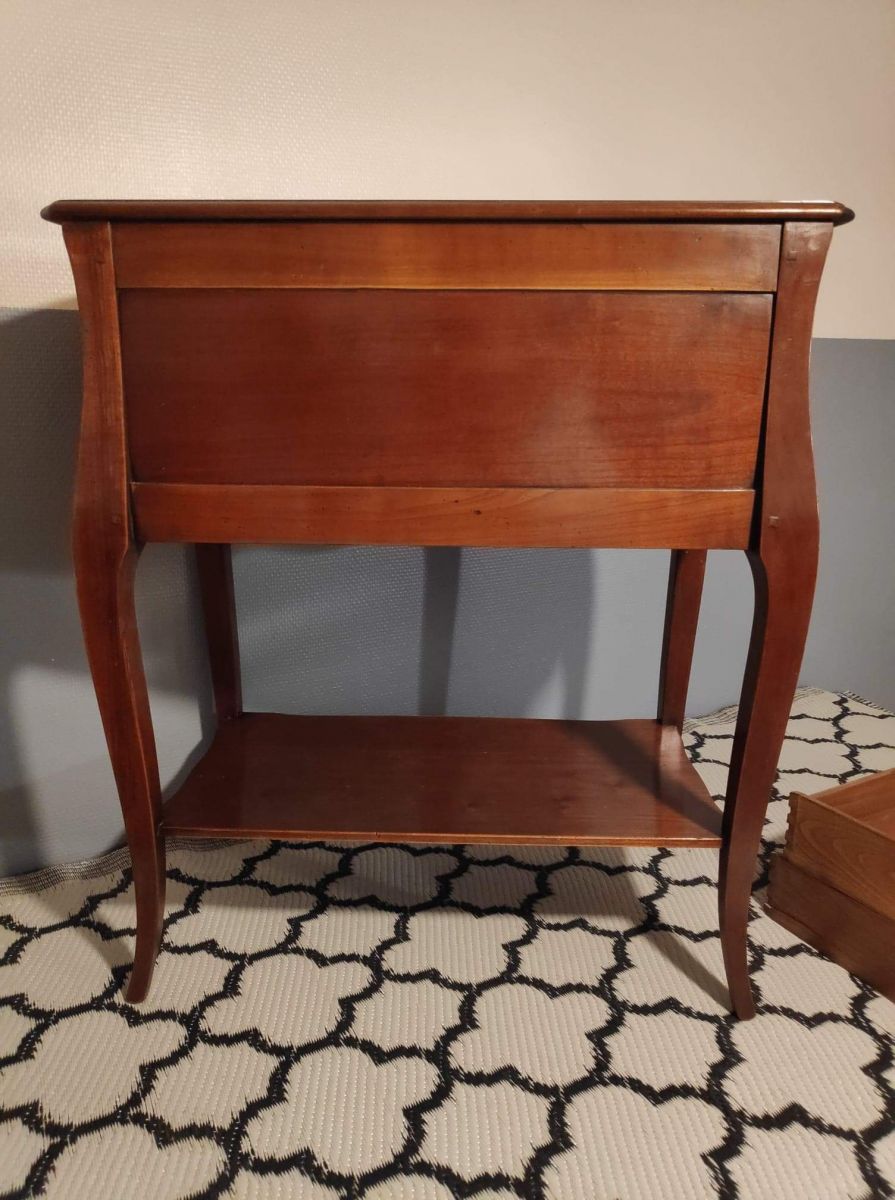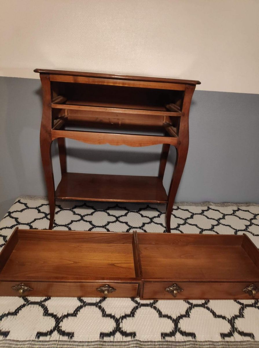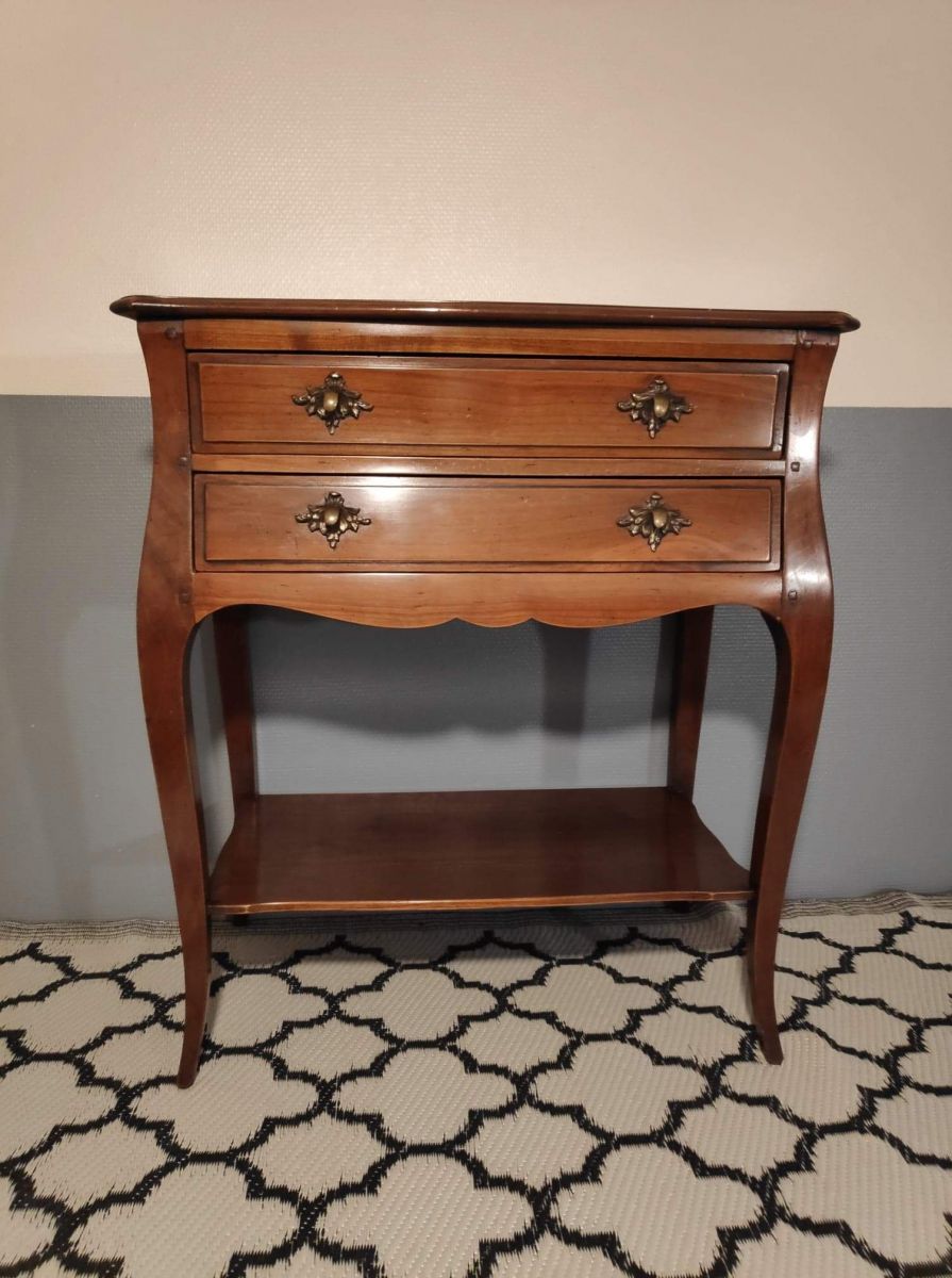 commode galbée avec 2 tiroirs et 1 plateau en merisier style Louis XV