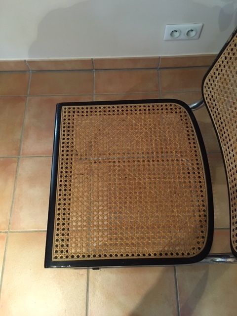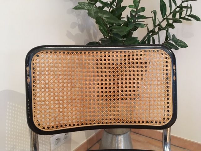 lot de 4 chaises B32 Marcel Breuer, assise et dossier en bois noir et cannage, en bon état , a noter quelques marques d'usure sur le dossier, vrai vintage ayant déjà servi. H 79 L46 P 42