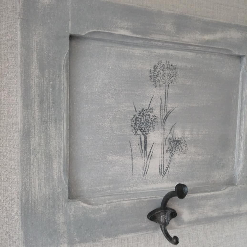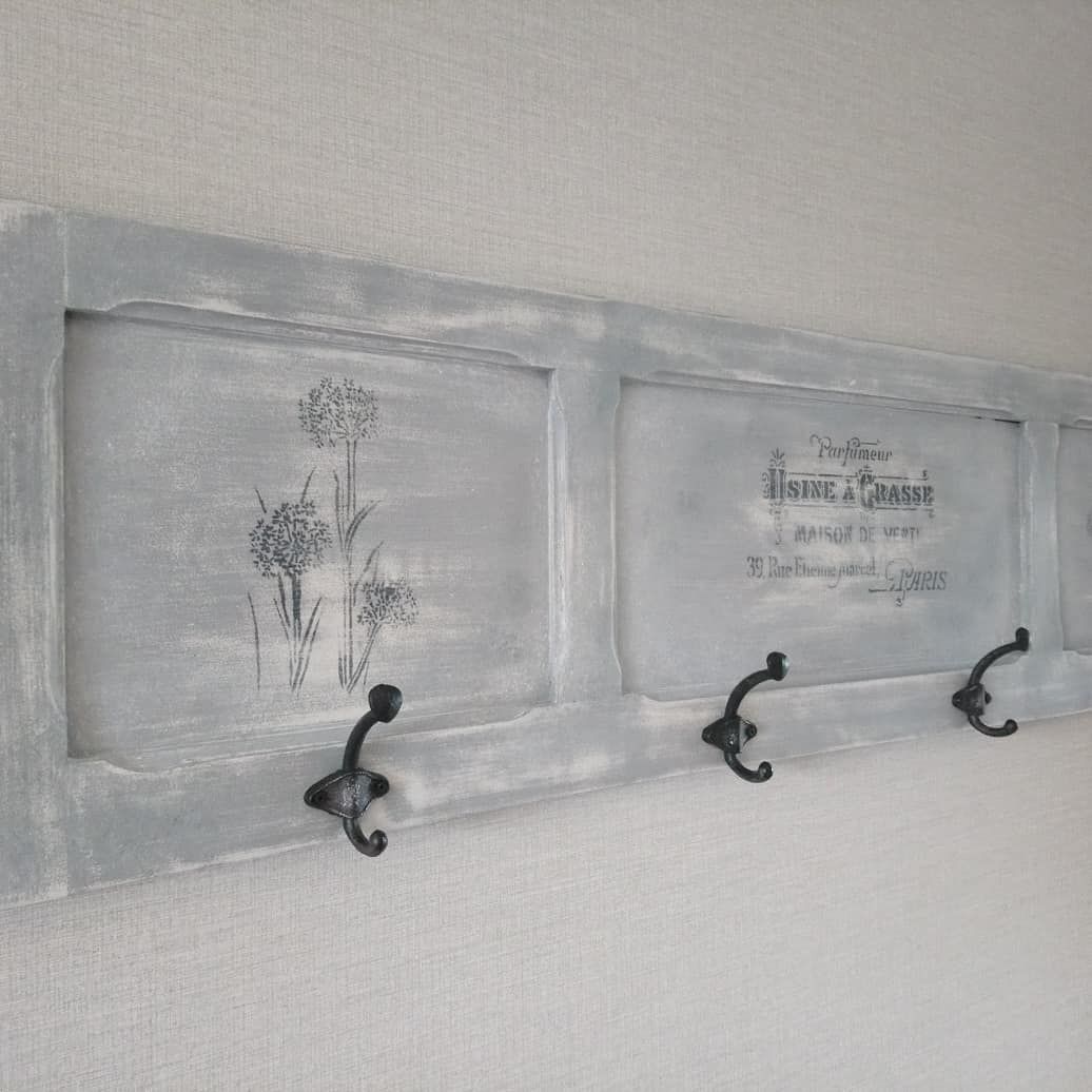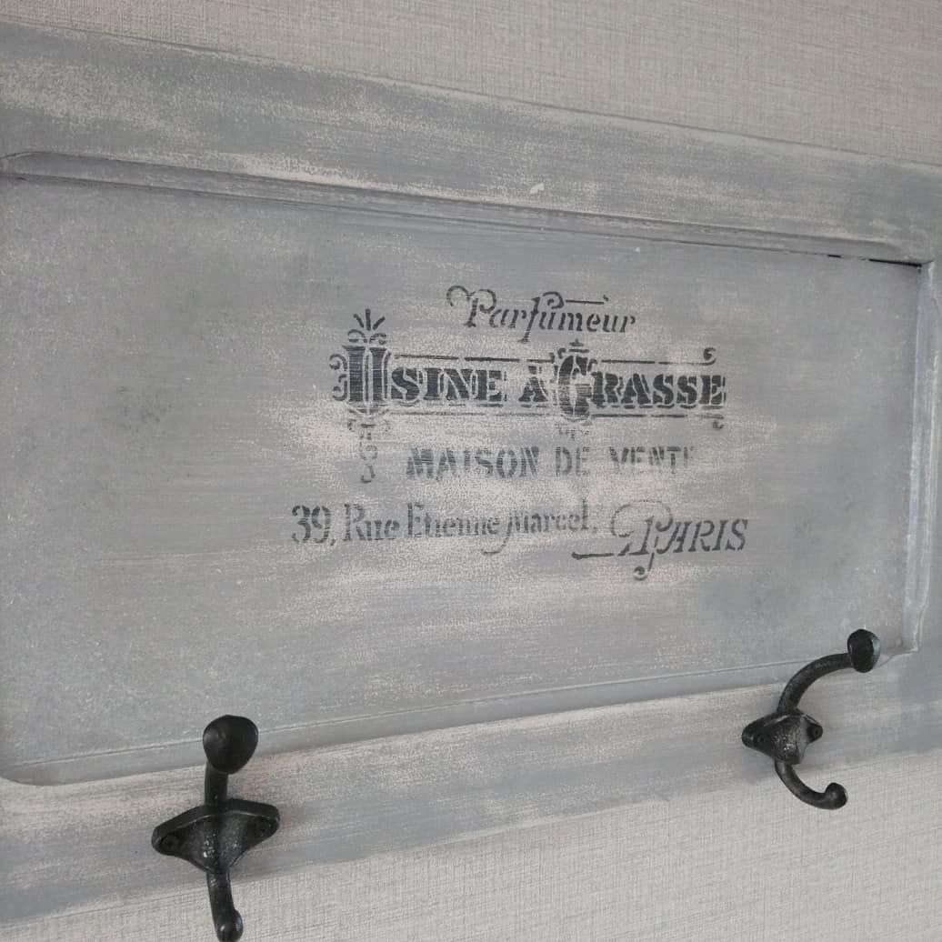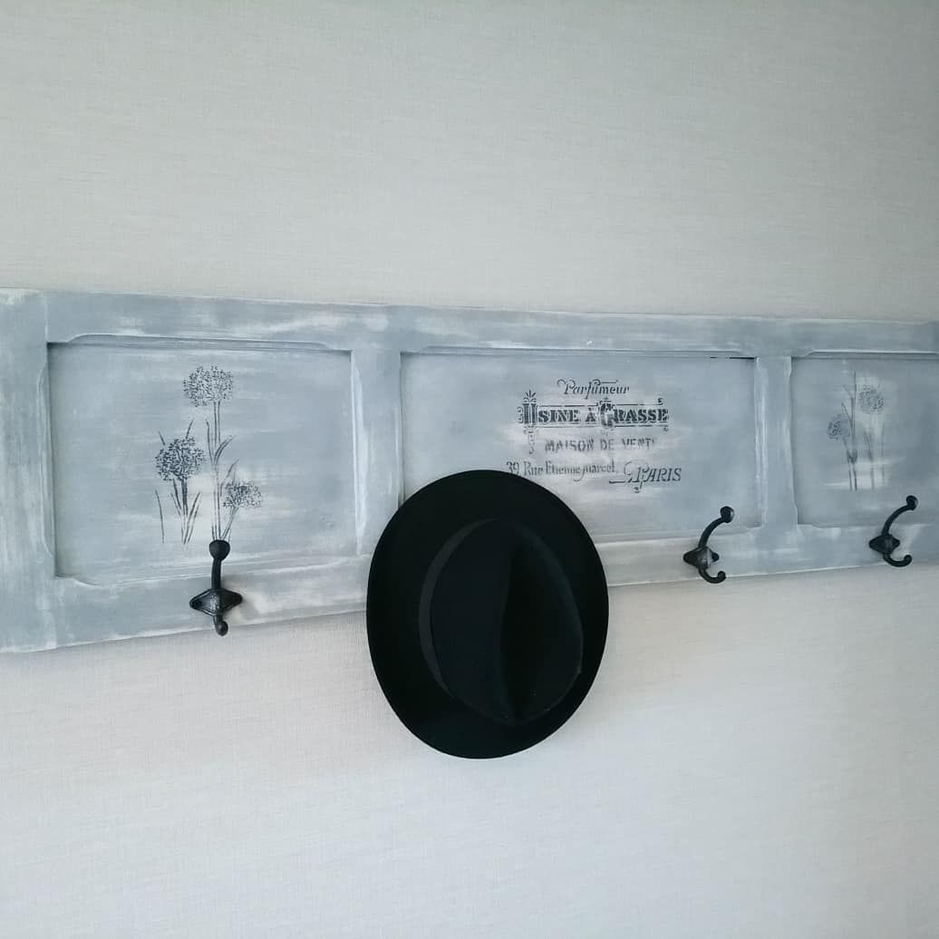 Joli porte manteaux peint en gris patiné blanc, quelques pochoirs floraux.