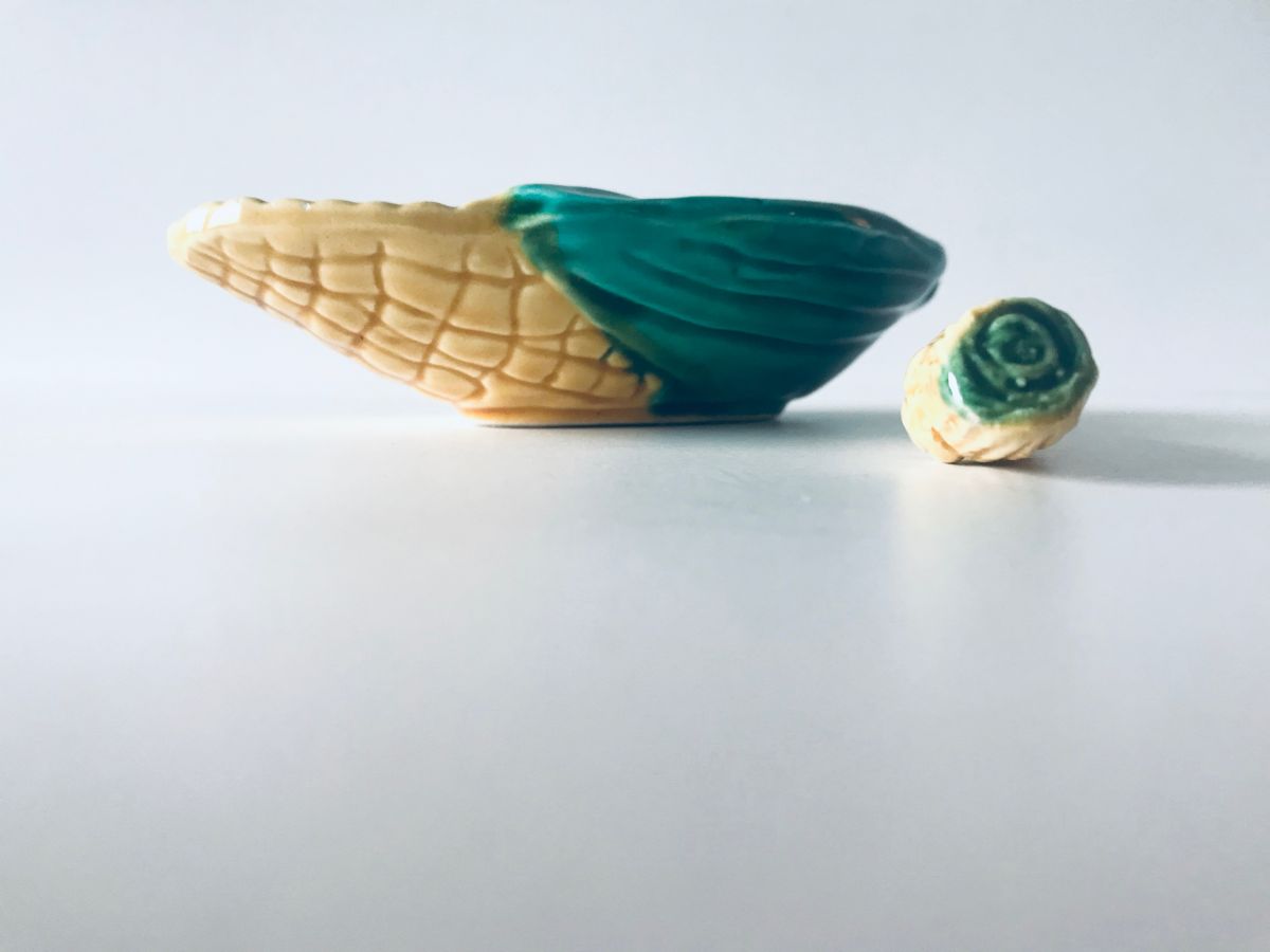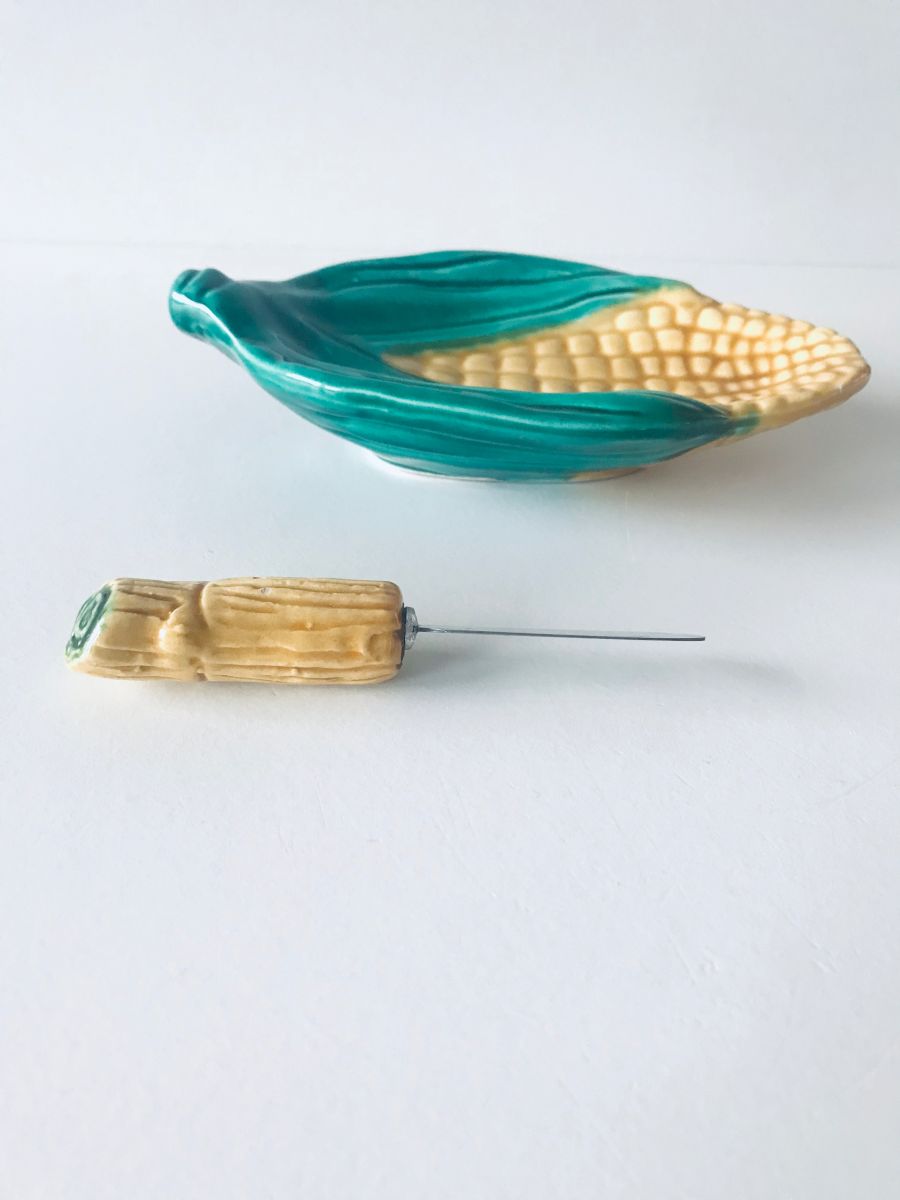 Ensemble beurrier et couteau épi de maïs, céramique barbotin