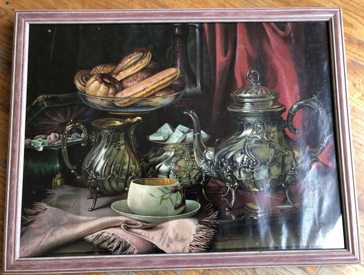 chromolithographie ancienne, représentant l'heure du thé. Encadrée et sous verre