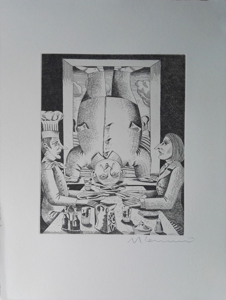 Superbe gravure originale signée au crayon par l'artiste. Pointe sèche pour Alice au pays des merveilles de Lewis Carroll.