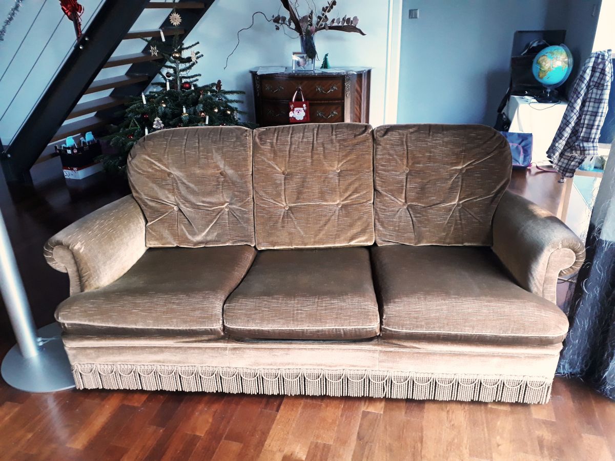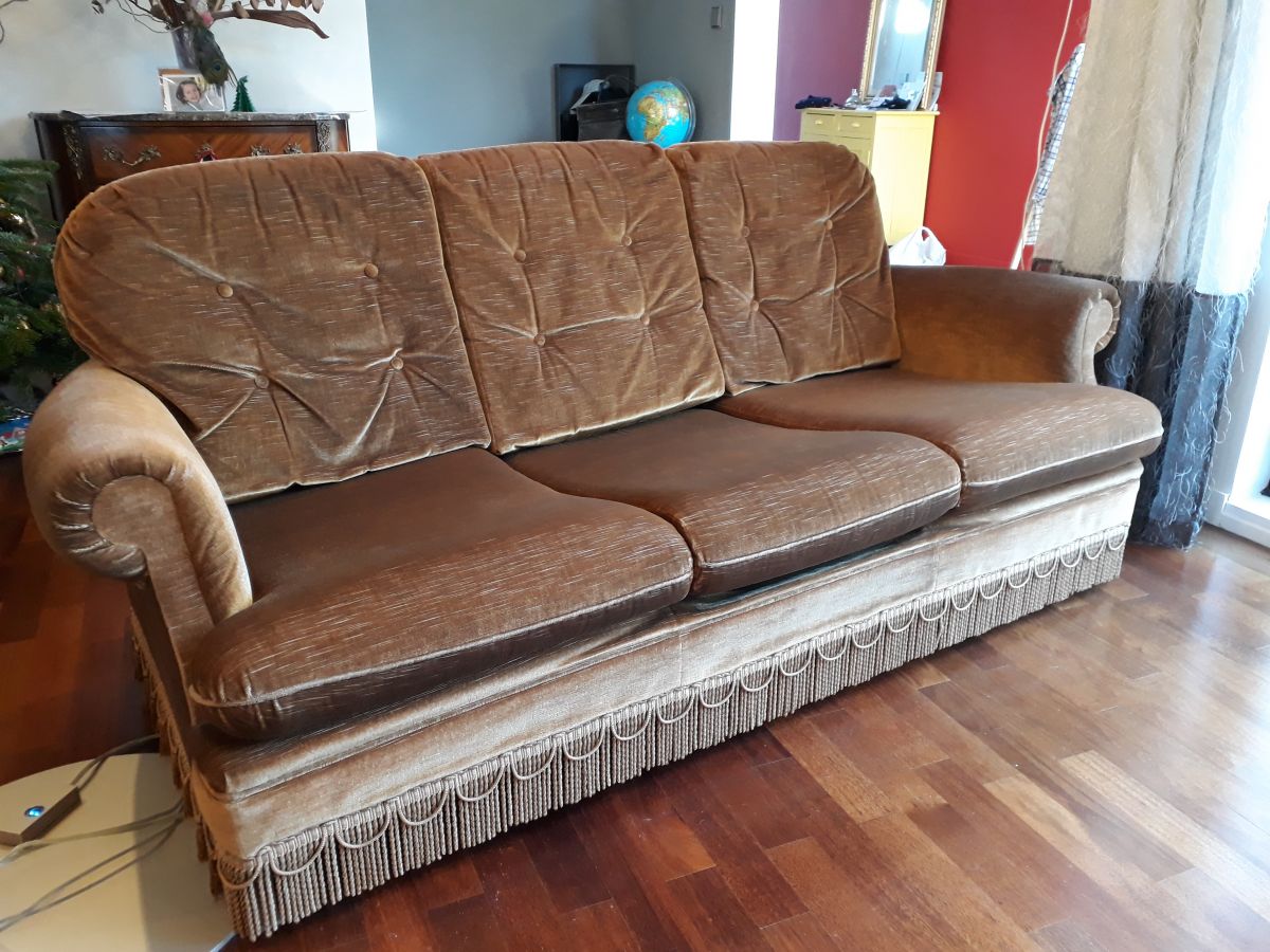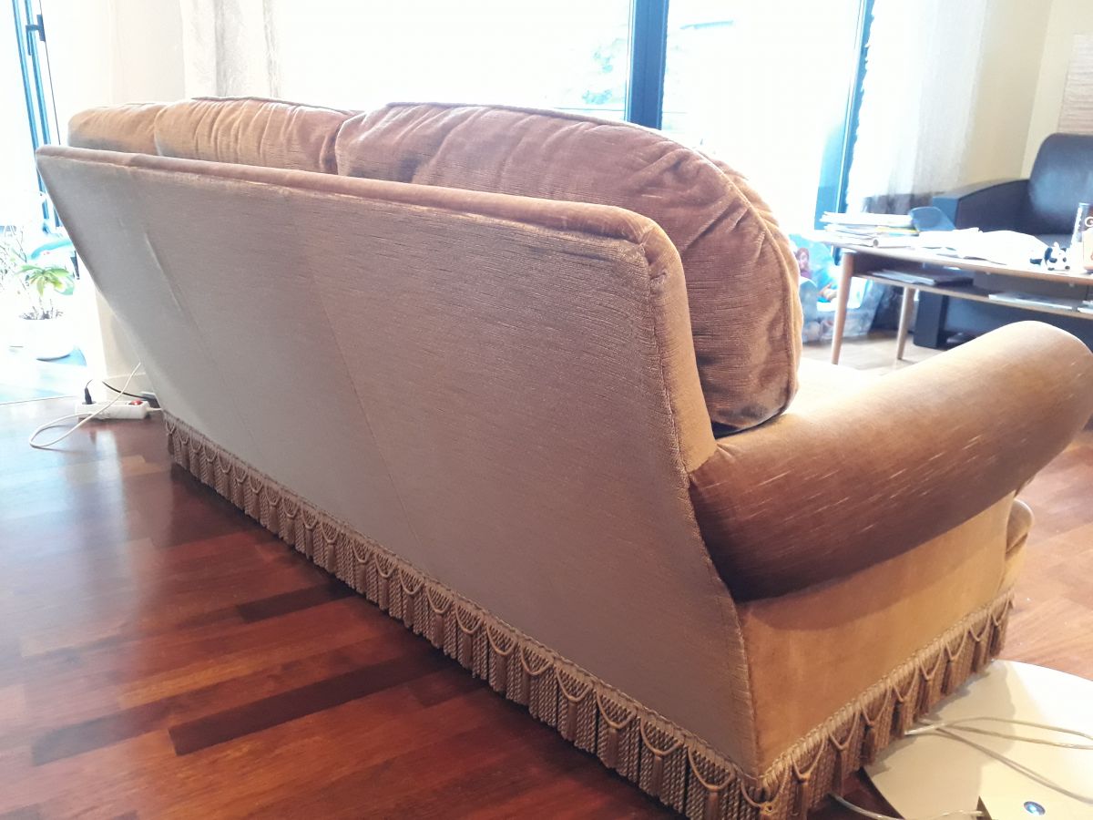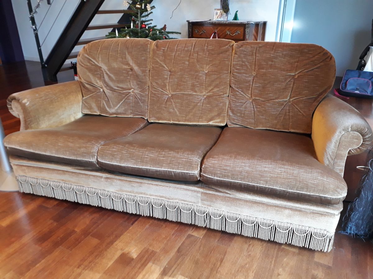 Canapé crapaud en velours à franges couleur cognac. Les coussins d'assise ont été refaits et sont bien fermes. Très bon confort. Pas de tâche, pas de déchirure (léger accro peu visible 2cm sur un accoudoir), mais sinon dans un très bon état.