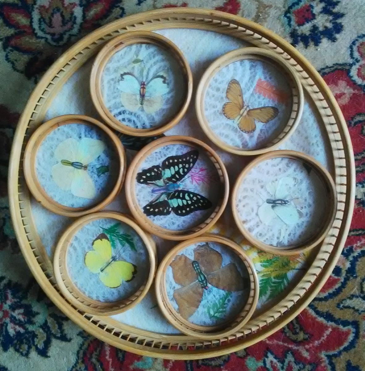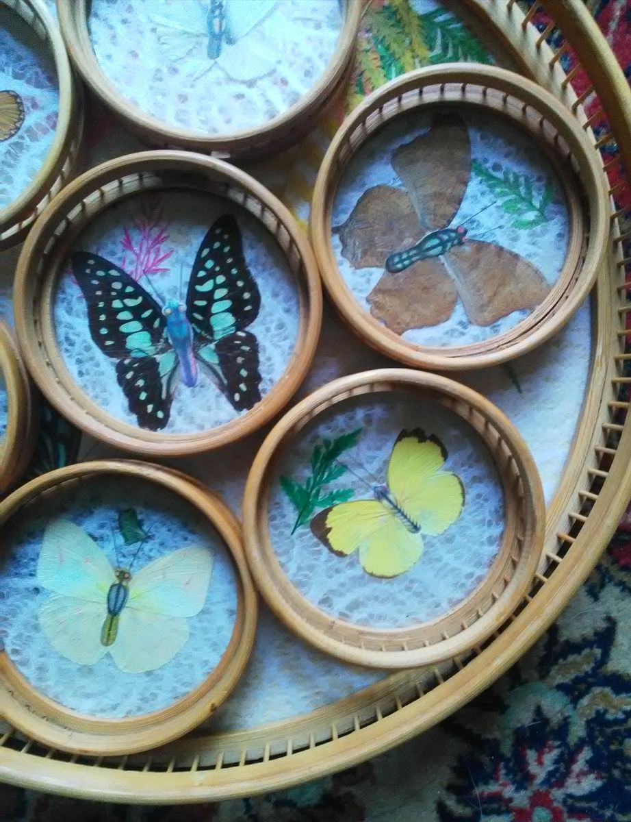 Décor papillons véritables et fleurs séchées sous verre et contour en bambou et rotin.
