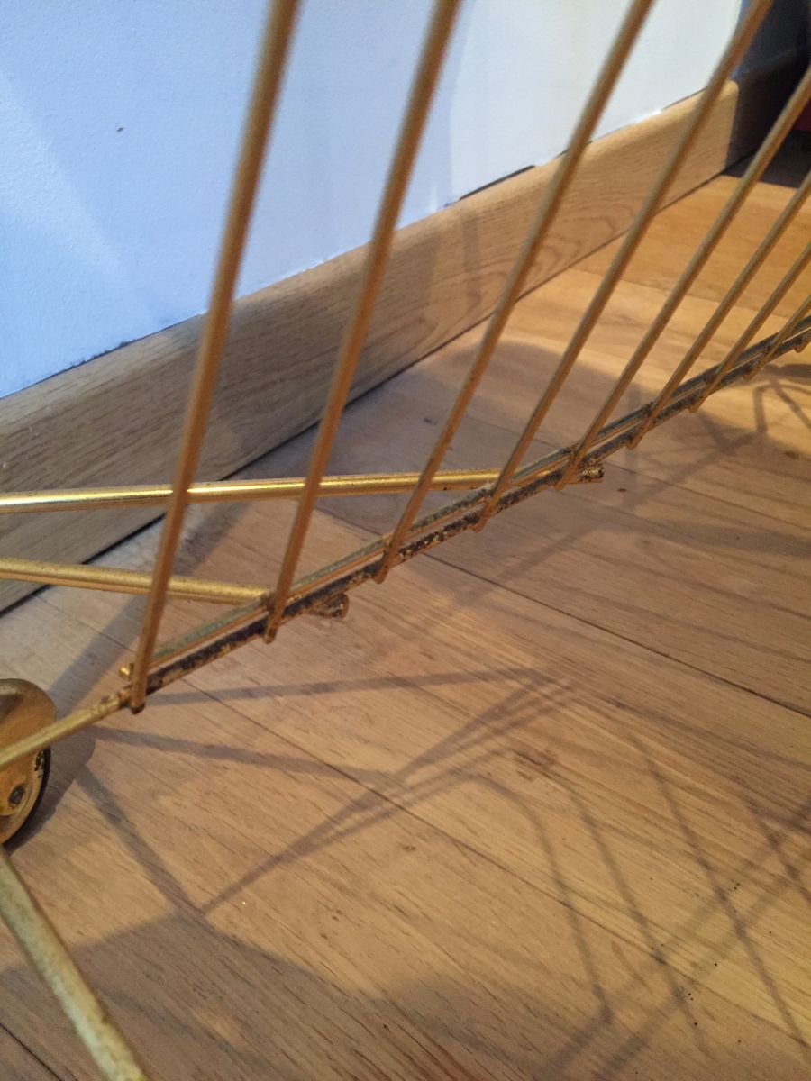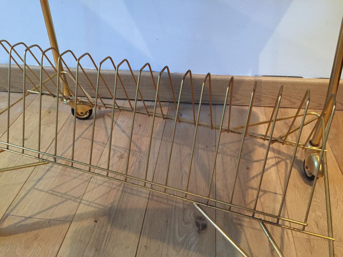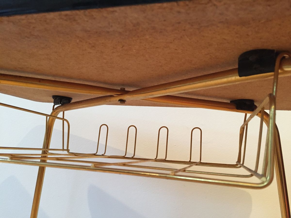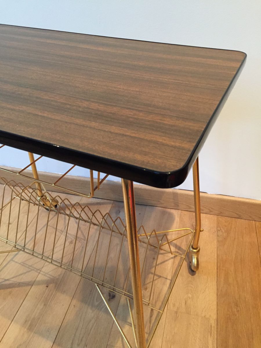 Petite table d'appoint, porte tourne disque et vinyles des années 60. Tout est d'origine. Le piètement est doré, le plateau est recouvert d'un vinyle imitation bois foncé. Cette table est globalement dans un très bon état. Il y a simplement quelques piqures sur le métal doré (voir photo), mais rien de grave.