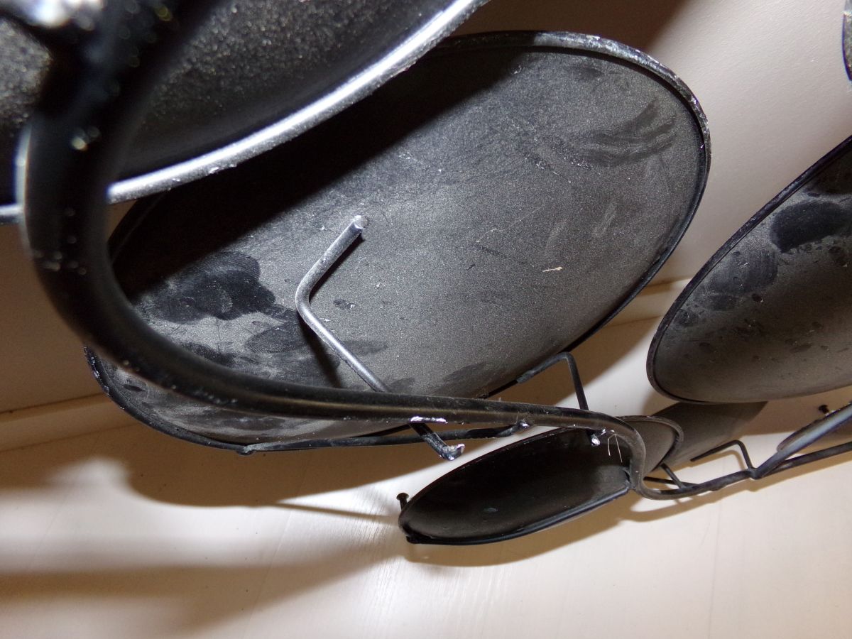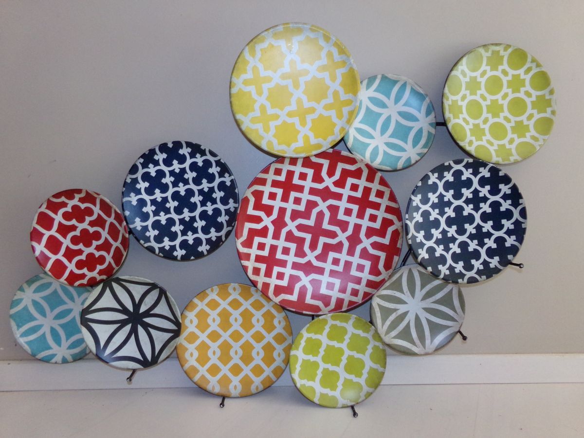 Superbe porte-manteaux mural en métal d'assiettes décoratives vintage multicolores. 5 patères pour accrocher les manteaux ou bien vos plus belles tasses dans la cuisine...Nous l'avions simplement en décoration au mur, de part ses couleurs il habillait amplement notre salon. Il manque 2 petits points de soudure au dos que je n'ai jamais fait étant donné que ça ne gênait en rien son utilisation.