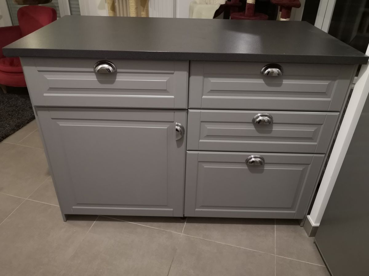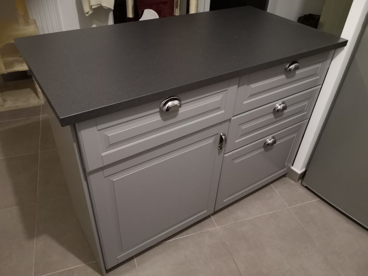 A vendre, îlot central de cuisine avec portes gris et moulures.