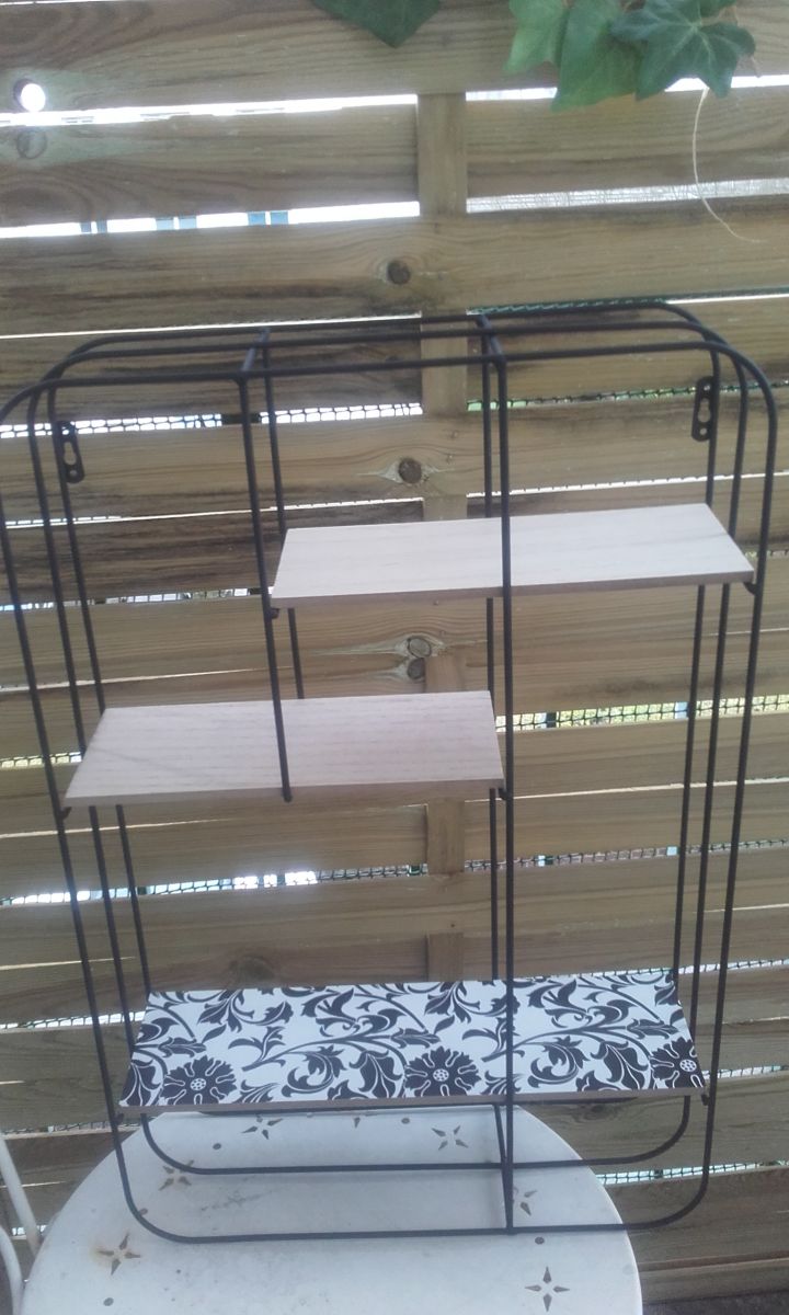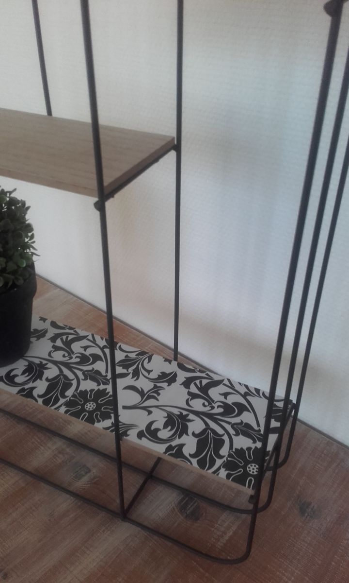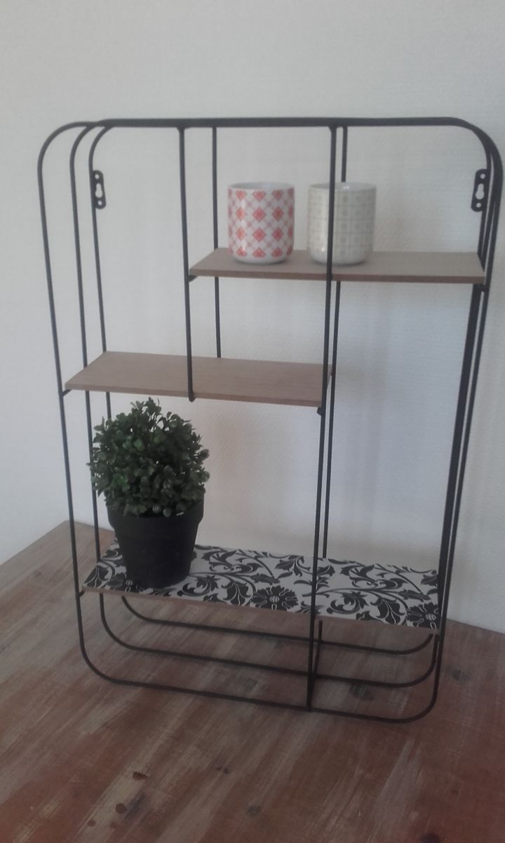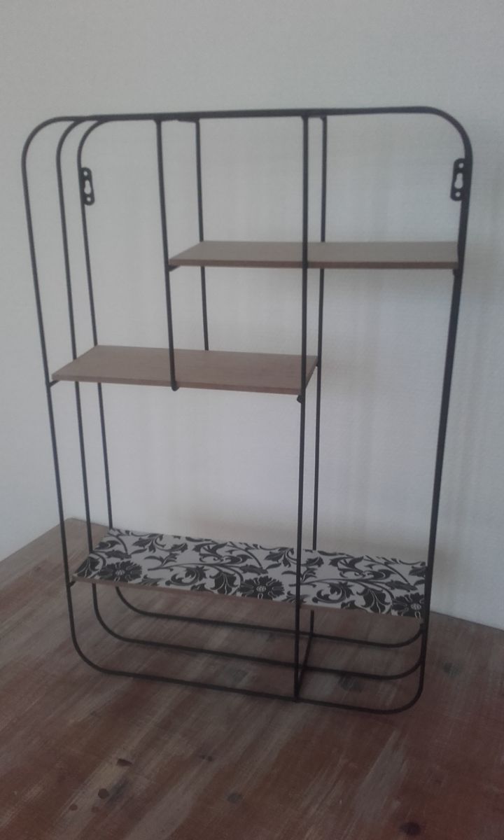 Étagère vintage bois et métal avec trois tablettes dont une déco vinyle.