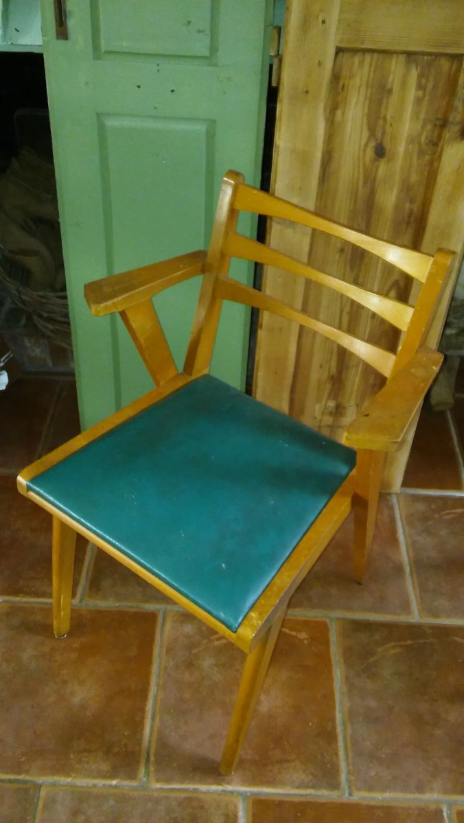 Ancien fauteuil vintage en Skai et bois, assise en bon état mais demande un recollage au niveau de la structure rien de méchant.