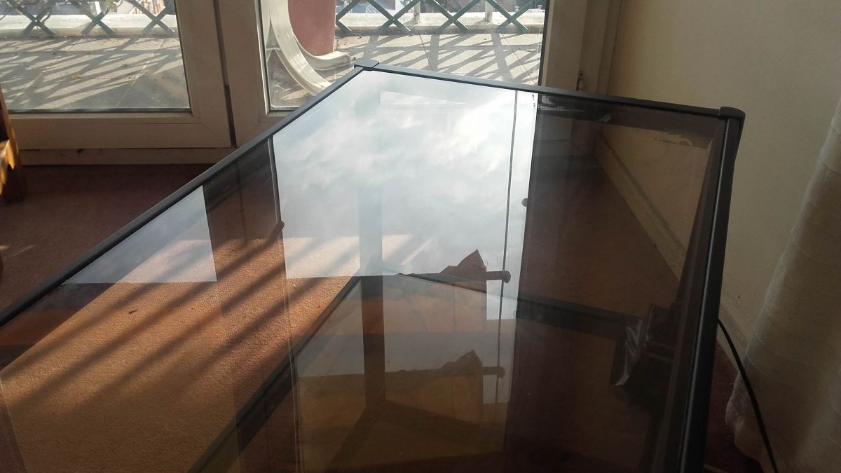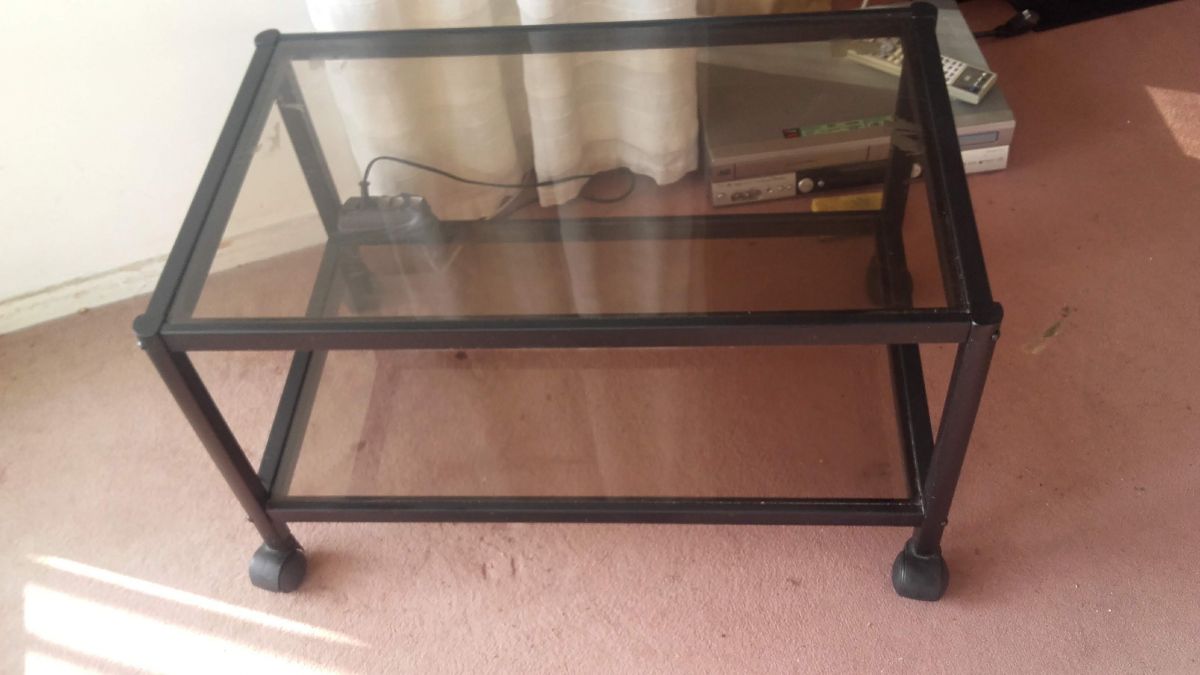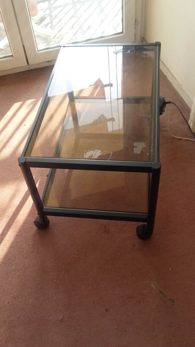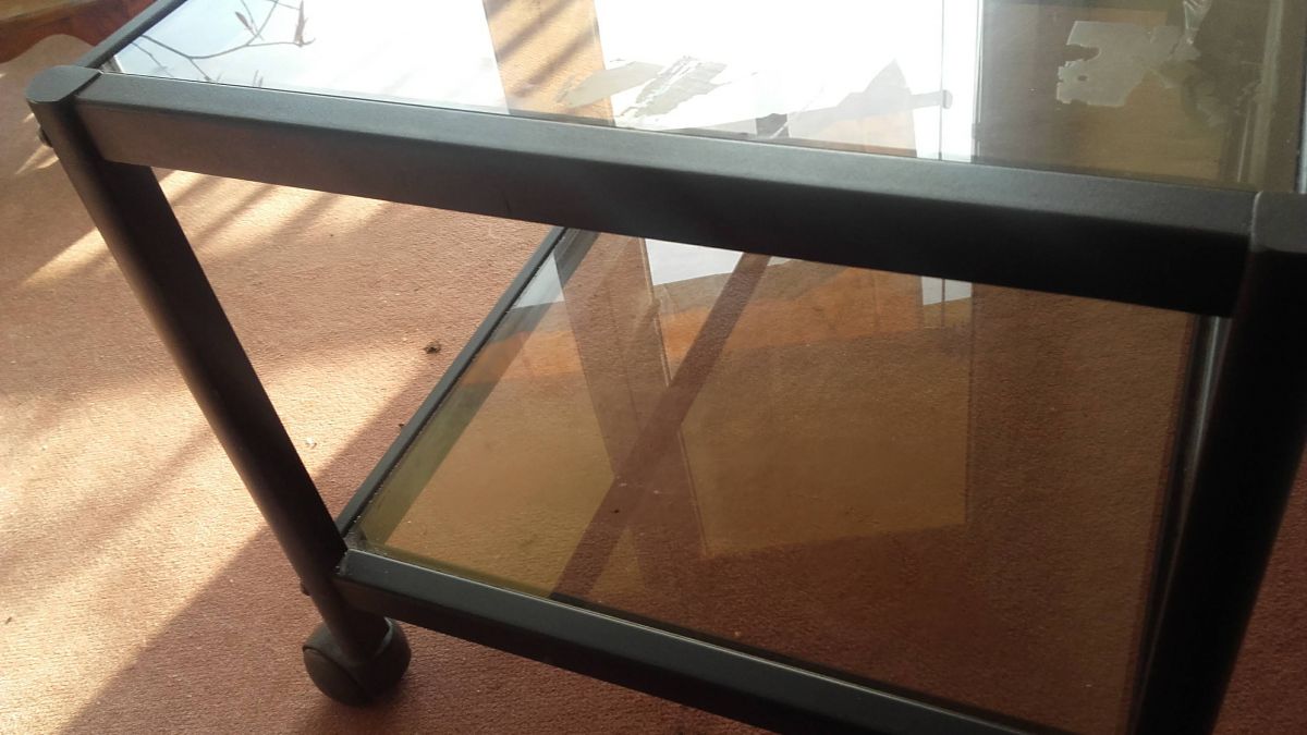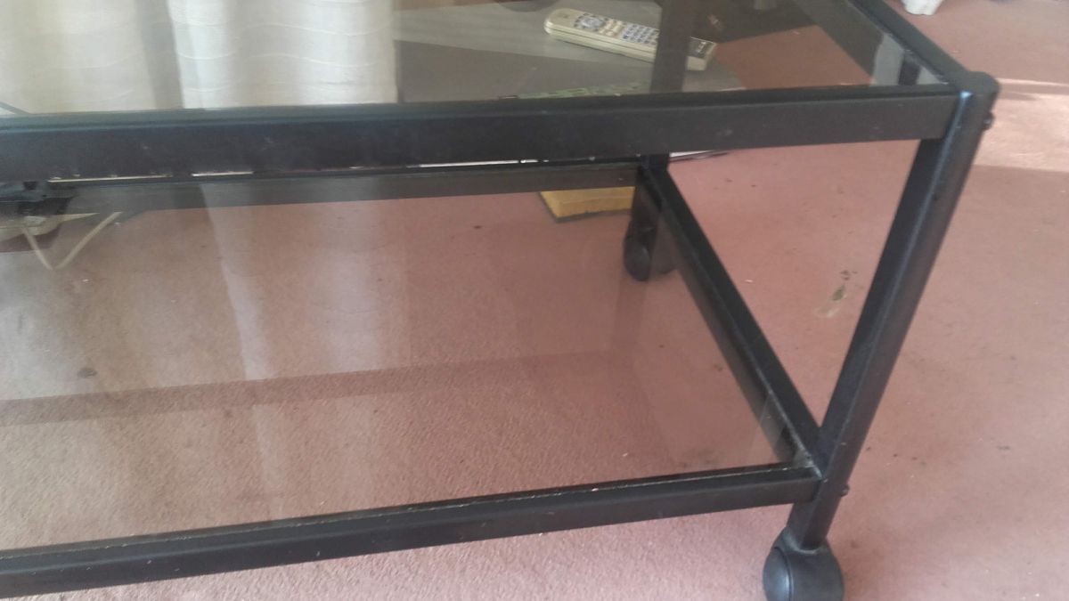 Meuble TV en verre fumé 2 étages, sur 4 roulettes.