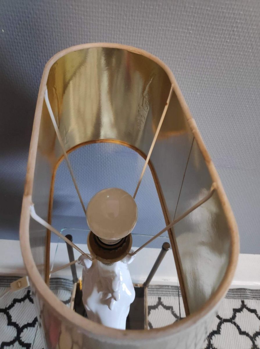 lampe tête de cheval en céramique blanche abat-jour beige et intérieur doré.
