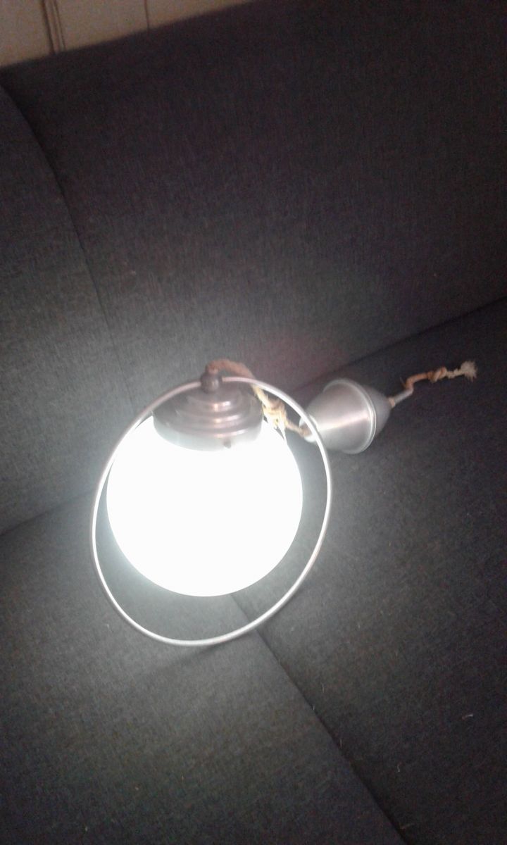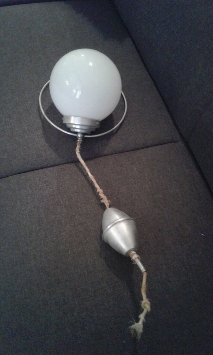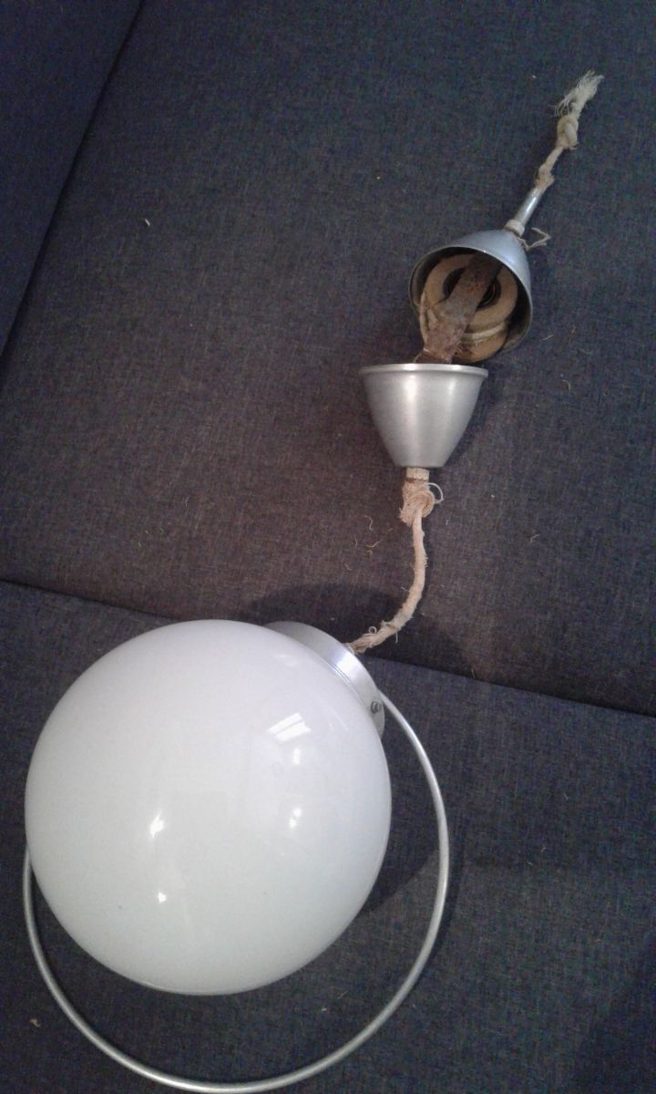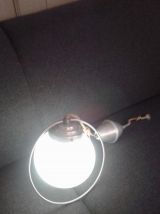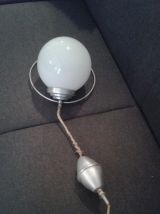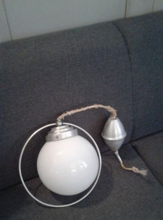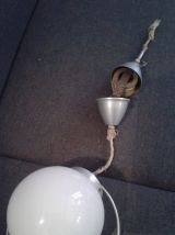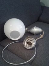 Suspension boule monte baisse en alu et opaline fin années 40 époque Art Déco, elle n a subi aucune transformation' elle en bonne état,la partie électrique est à remplacer le globe mesure 63 cm de diamètre.