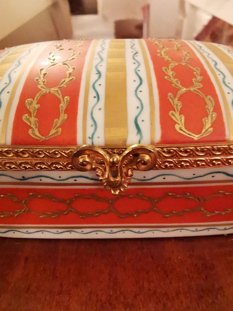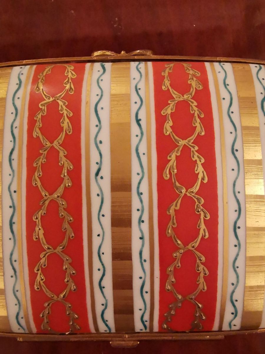 Boîte à bijoux peinte à la main dans l'atelier de belleville (paris) de camille le tallec en 1971. Chaque boîte sortie de l'atelier porte un signature différente et celle la date de 1971. La boîte est en excellent état, elle a été très bien conservée. La boîte est très élégante, les couleurs vives et les motifs sont dessinés avec beaucoup de finesse. Le métal est du laiton doré. Elle peut être placée sur un coiffeuse ou bien même sur un bureau ou une entrée pour y mettre de petits objets et ajouter un peu d'authenticité au décor. Dimensions l 10, 5cm h 4, 5 p 8cm.
