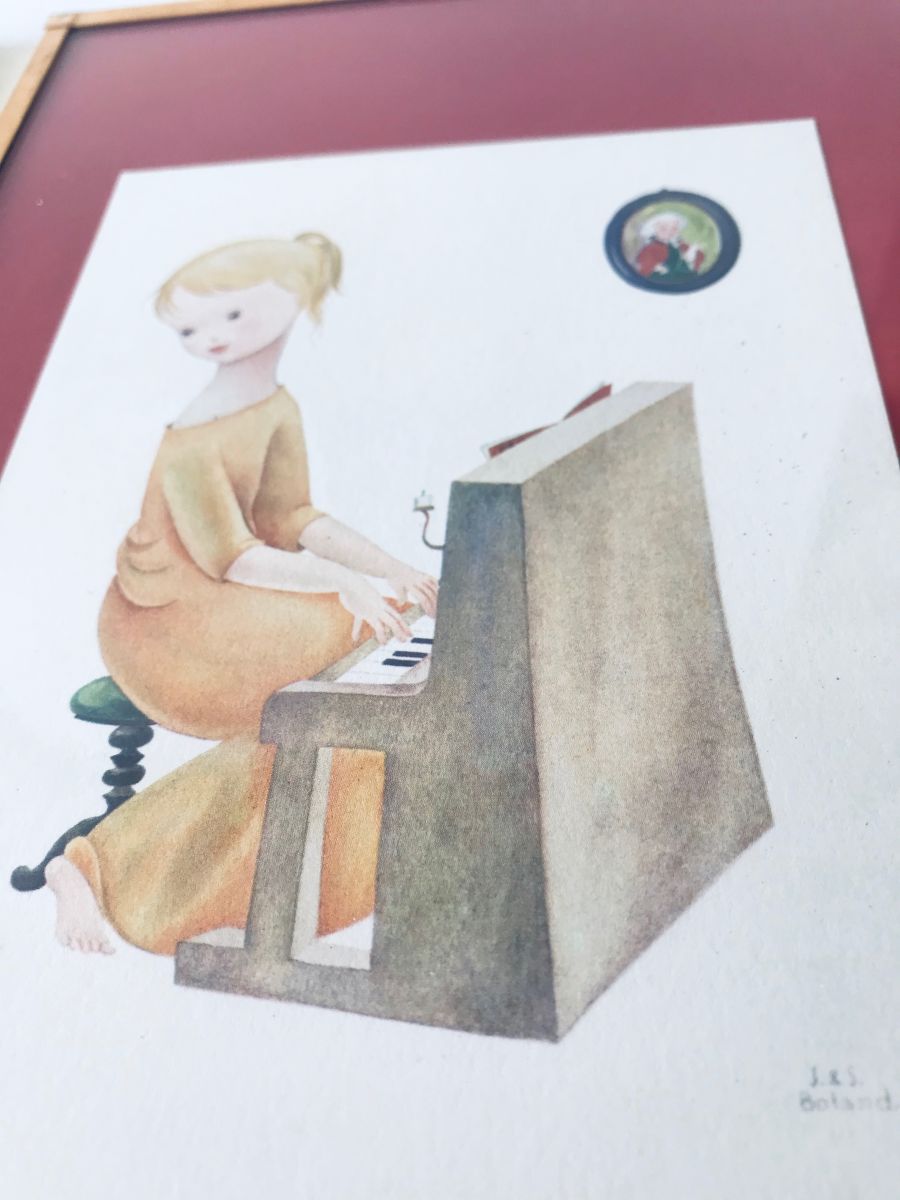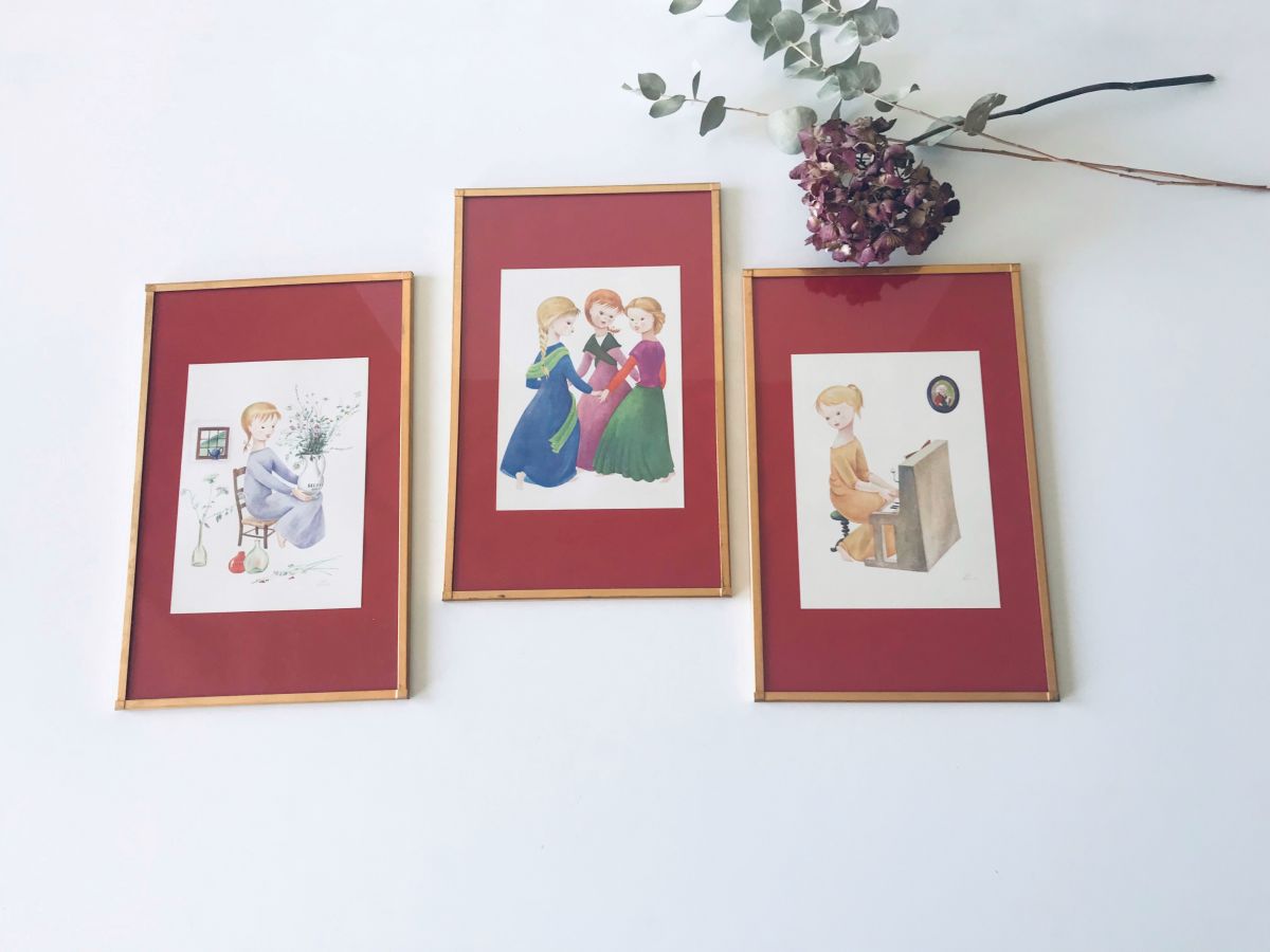 Joli ensemble de 3 petites illustrations encadrées. Ces tableaux sont très décoratifs les cadres sont en laiton dorés. Les illustrations représentent des scènes anciennes avec des fillettes qui dansent, jouent du piano composent un bouquet de fleurs. Idéal chambre d’enfant.